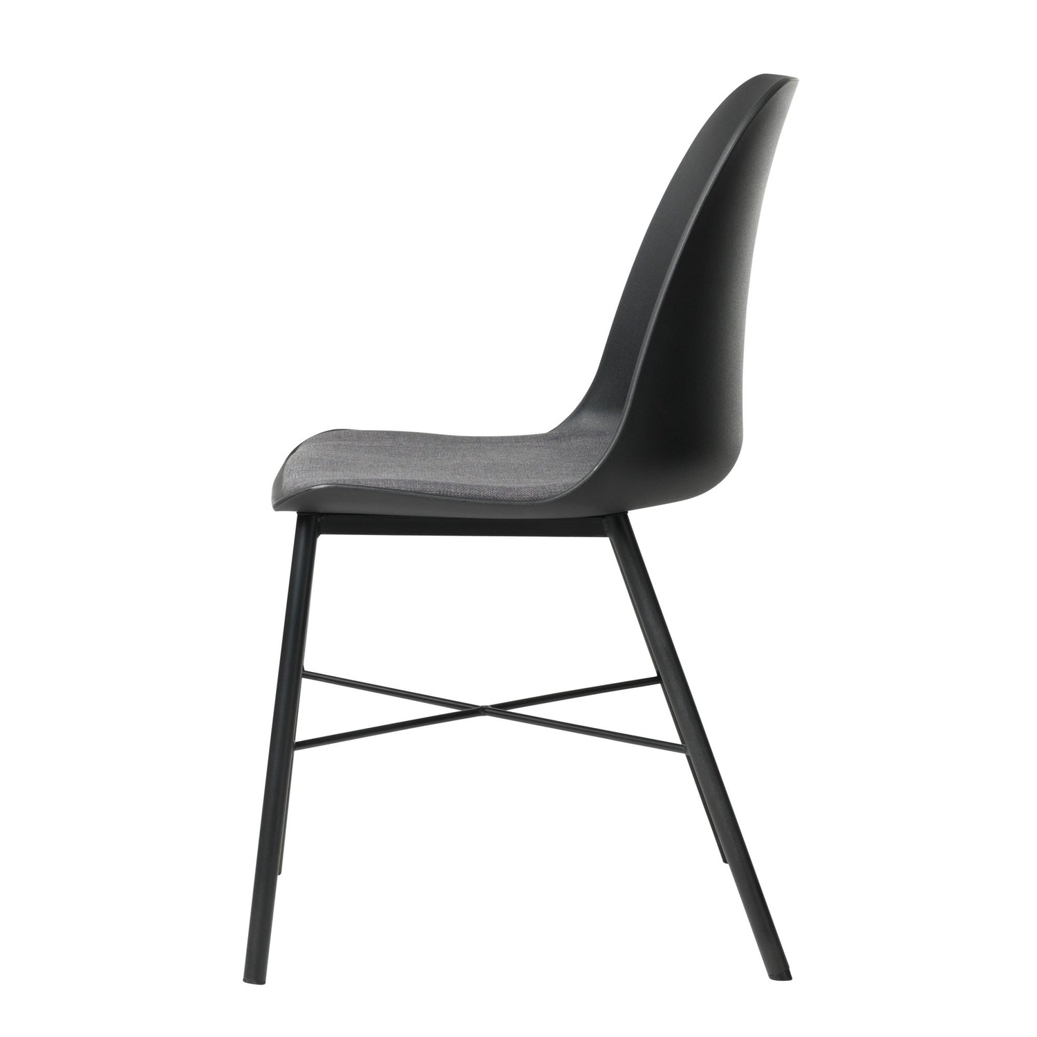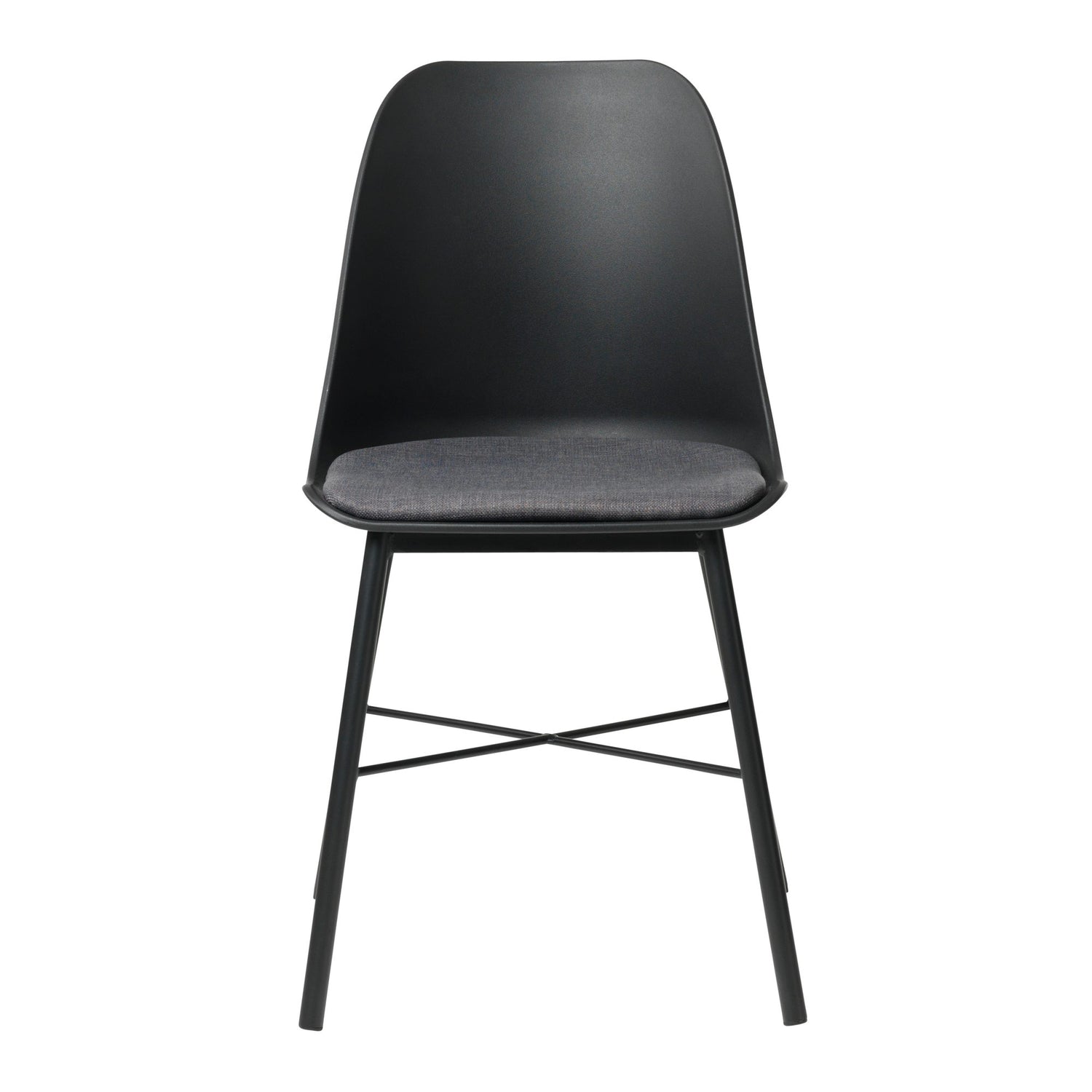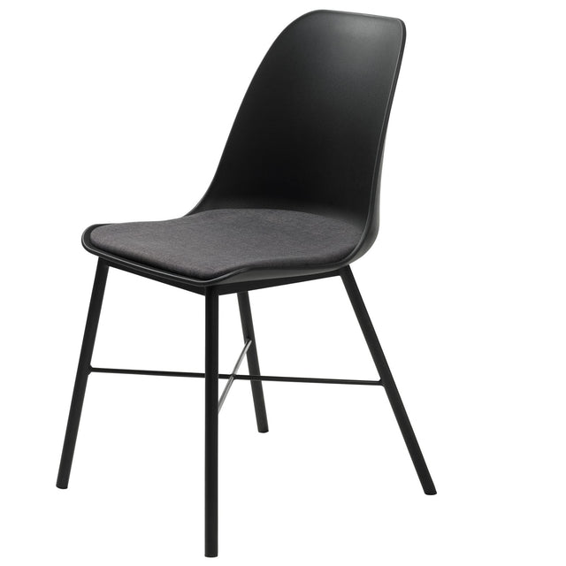 Diamante i svart ger ett grafiskt, elegant uttryck runt bordet. Den strama färgen möter mjuk komfort via den vadderade sitsdynan och den följsamma ryggens form. Underredet i svart metall ger ett enhetligt och stilrent helhetsintryck.