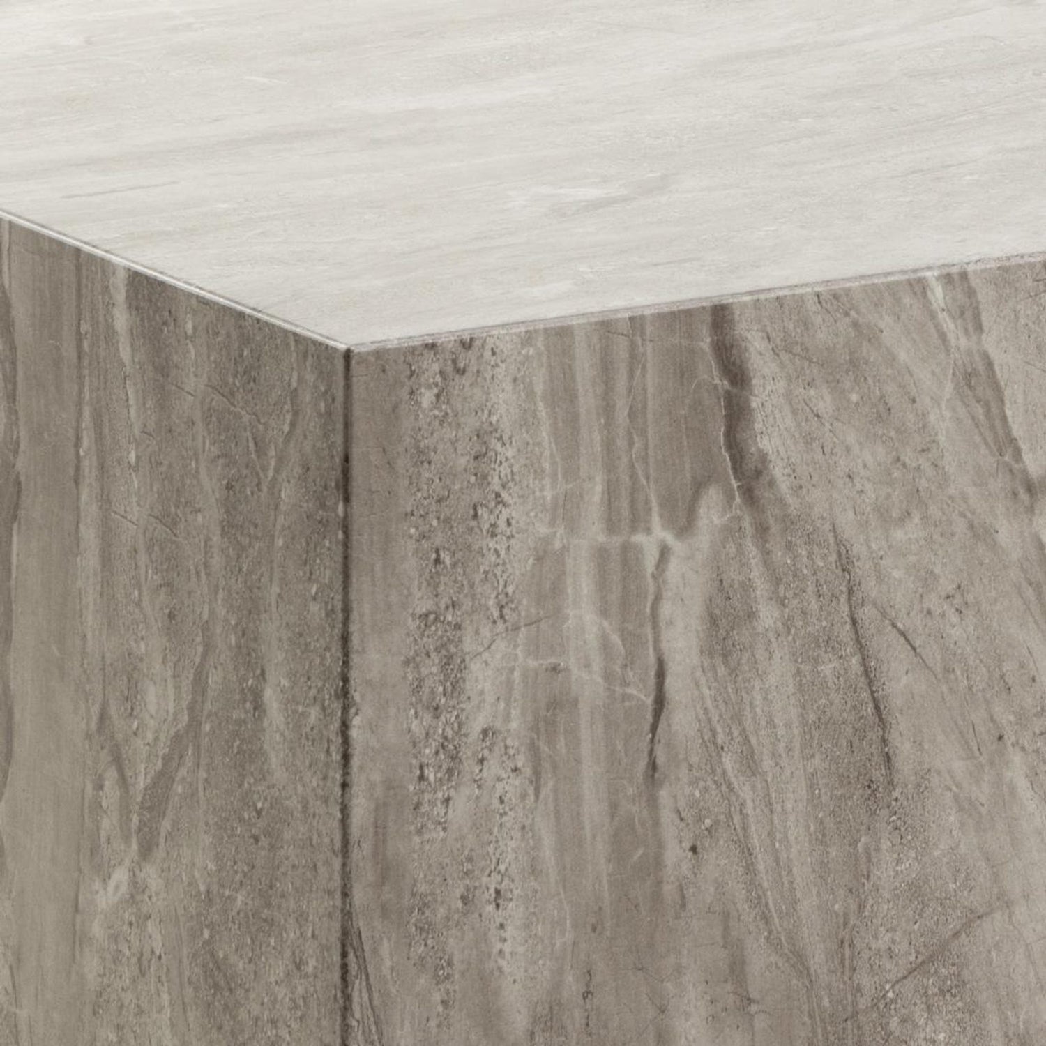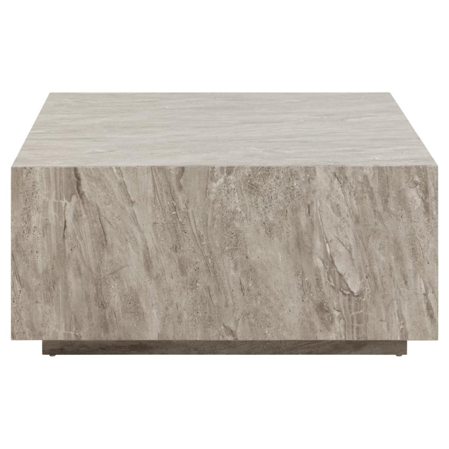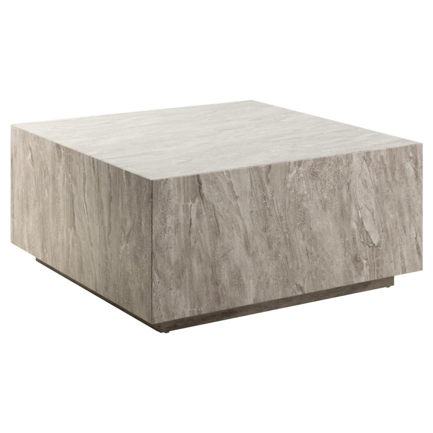 Redo att göra ett uttalande? Då är detta fyrkantiga soffbord perfekt för dig. Det grå marmorutseendet ger bordet en modern känsla och lägg märke till hur den subtila låga basen ger bordet en arkitektonisk touch. Detta bord erbjuder mycket yta för en hög med böcker och drycker och snacks under nästa träff.