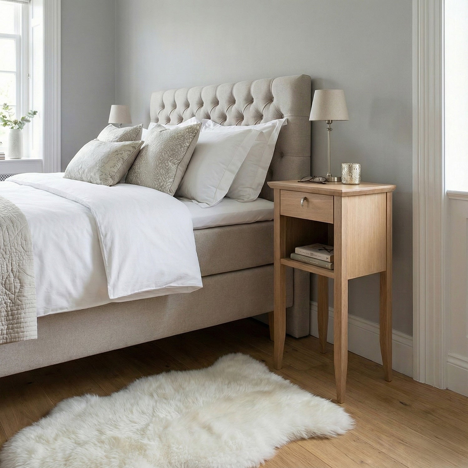 Ekliden sängbord i oljad ek. Detta klassiska sängbord i både massiv och fanerad oljad ek tillhör ett av våra mest uppskattade sängbord. Här finns både en förvaringslåda och ett fack under lådan att utnyttja. Toppskivan är fasad och sängbordet med sin höjd på 76 cm gör den perfekt till dagens lite högre kontinentalsängar. Sängborden tillverkas i Europa och kommer färdigmonterade.