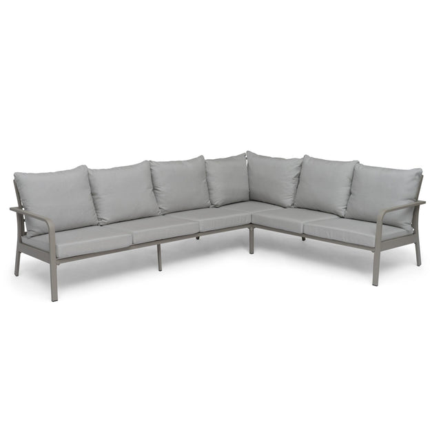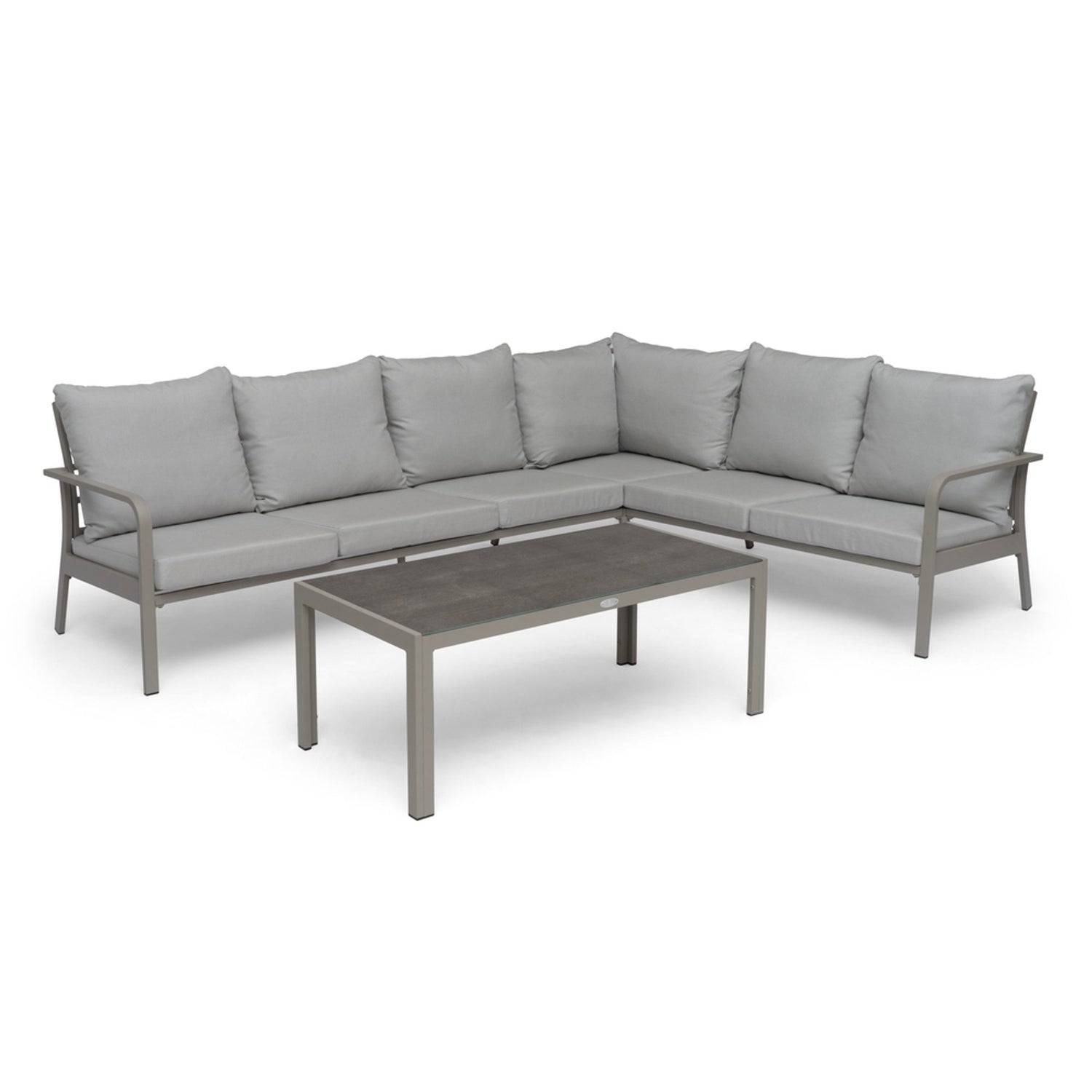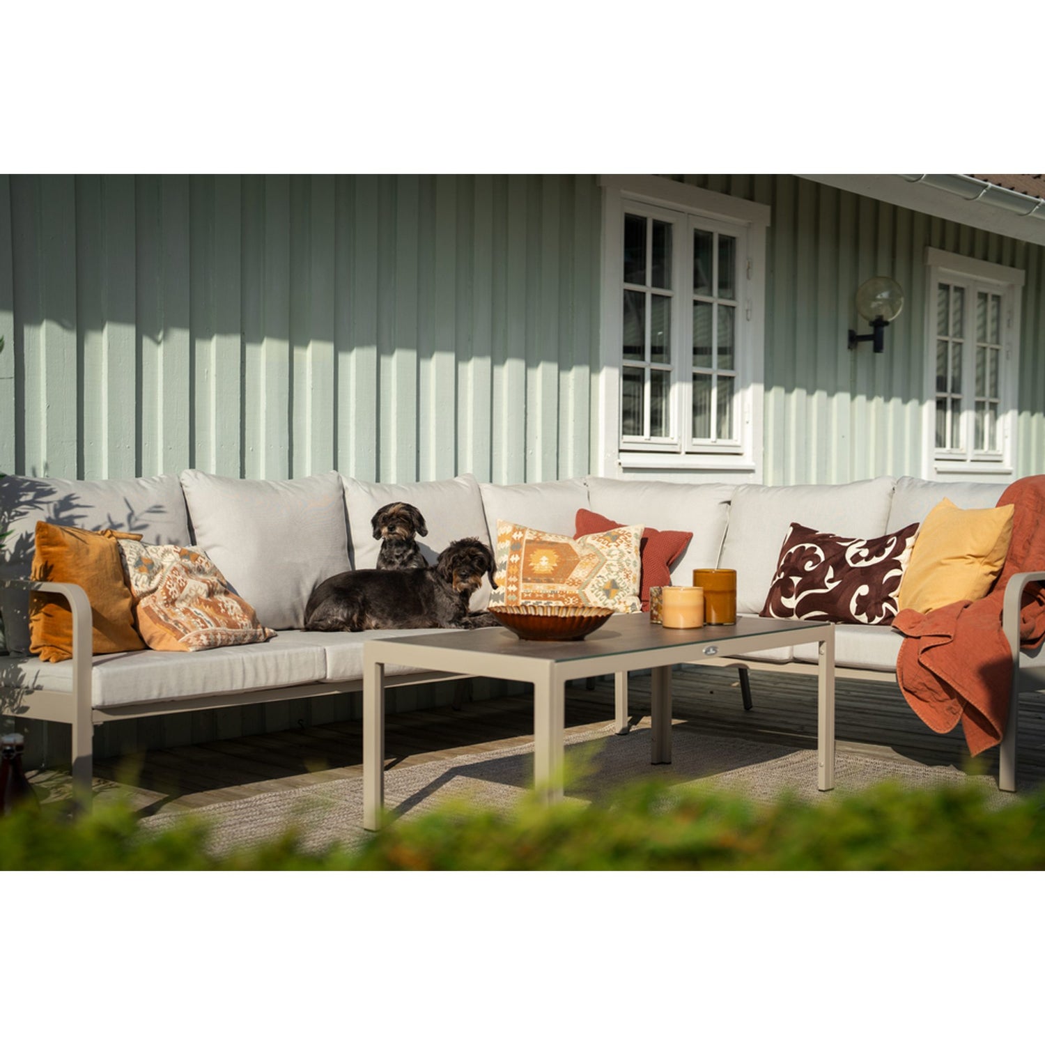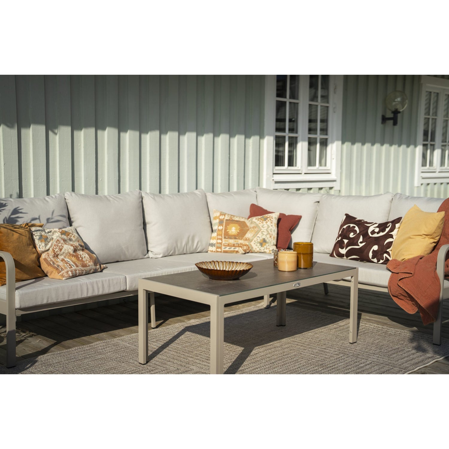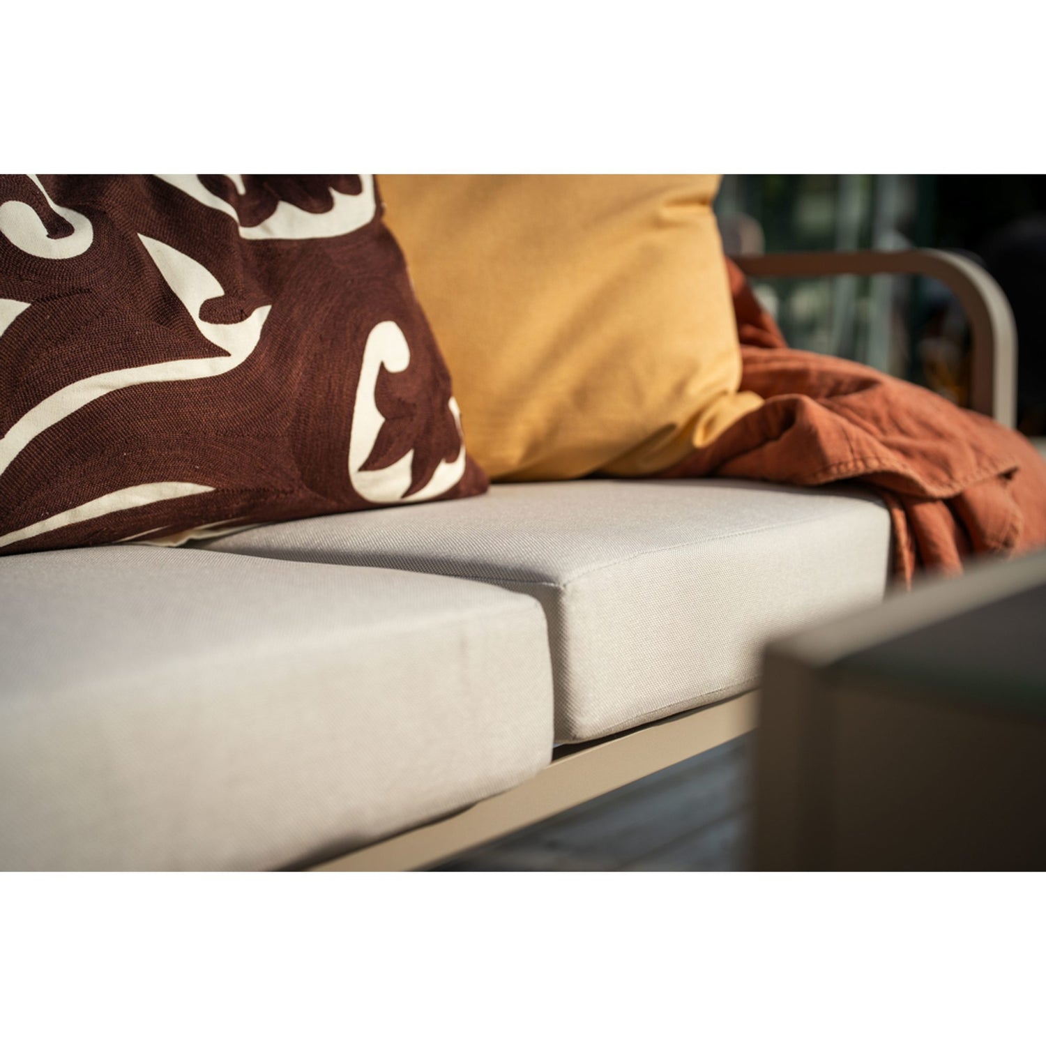 Tillverkad i hållbar aluminium och klädd med gråa dynor i olefin, är denna soffan både elegant och funktionell. Dynornas avtagbara klädsel kan enkelt tvättas för att hålla soffan fräsch, och den enkla handtvätten på 30 grader gör det lätt att ta hand om. Kombinera gärna soffan med ett matchande bord, som köps separat, för att skapa den perfekta uteplatsen.