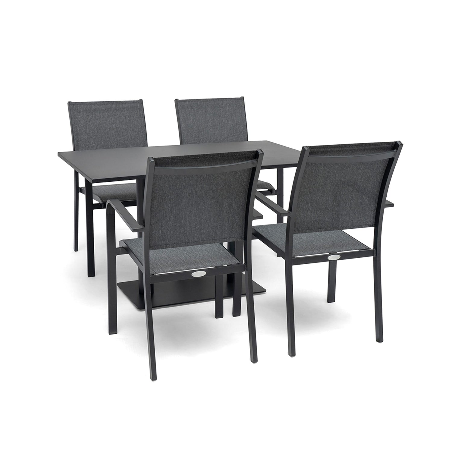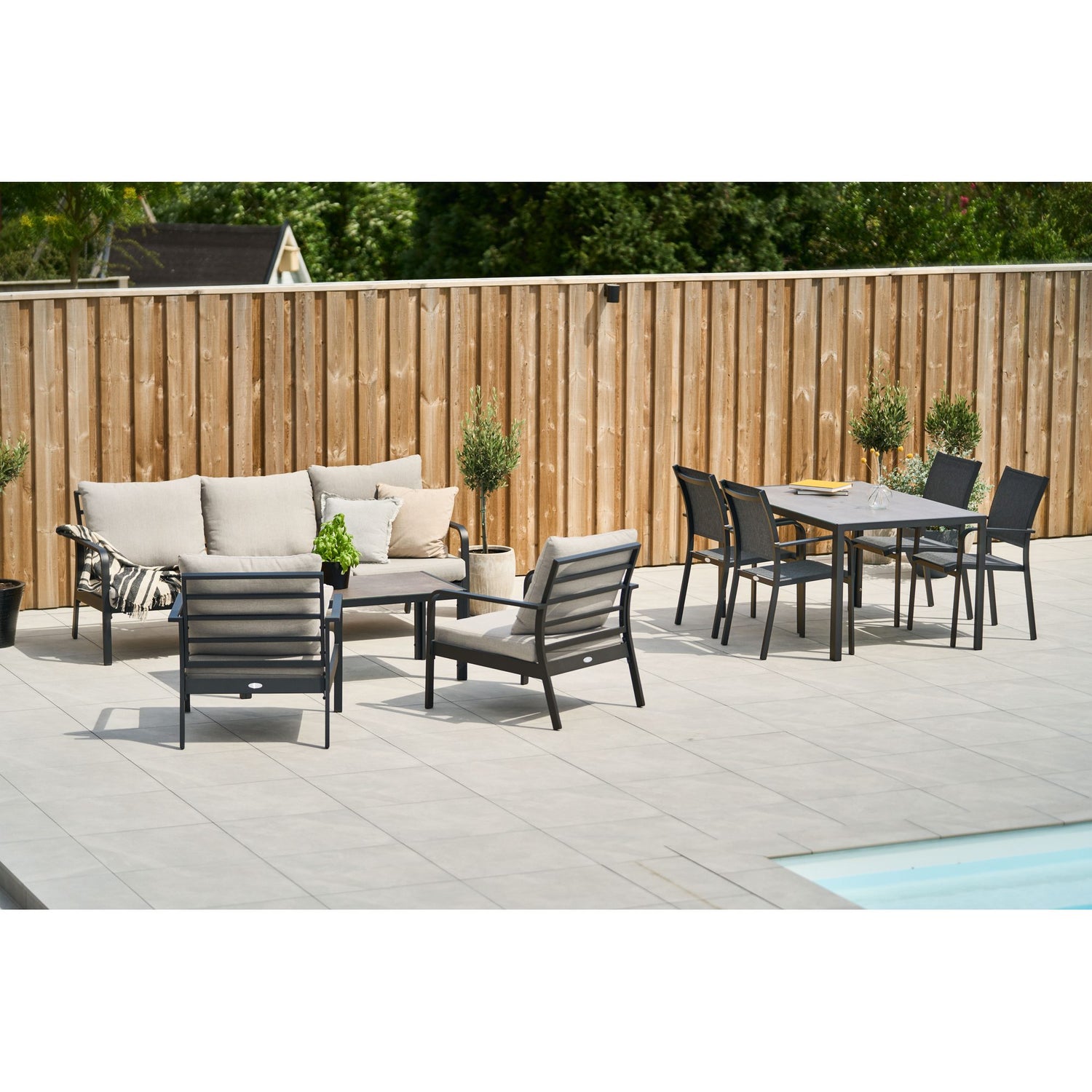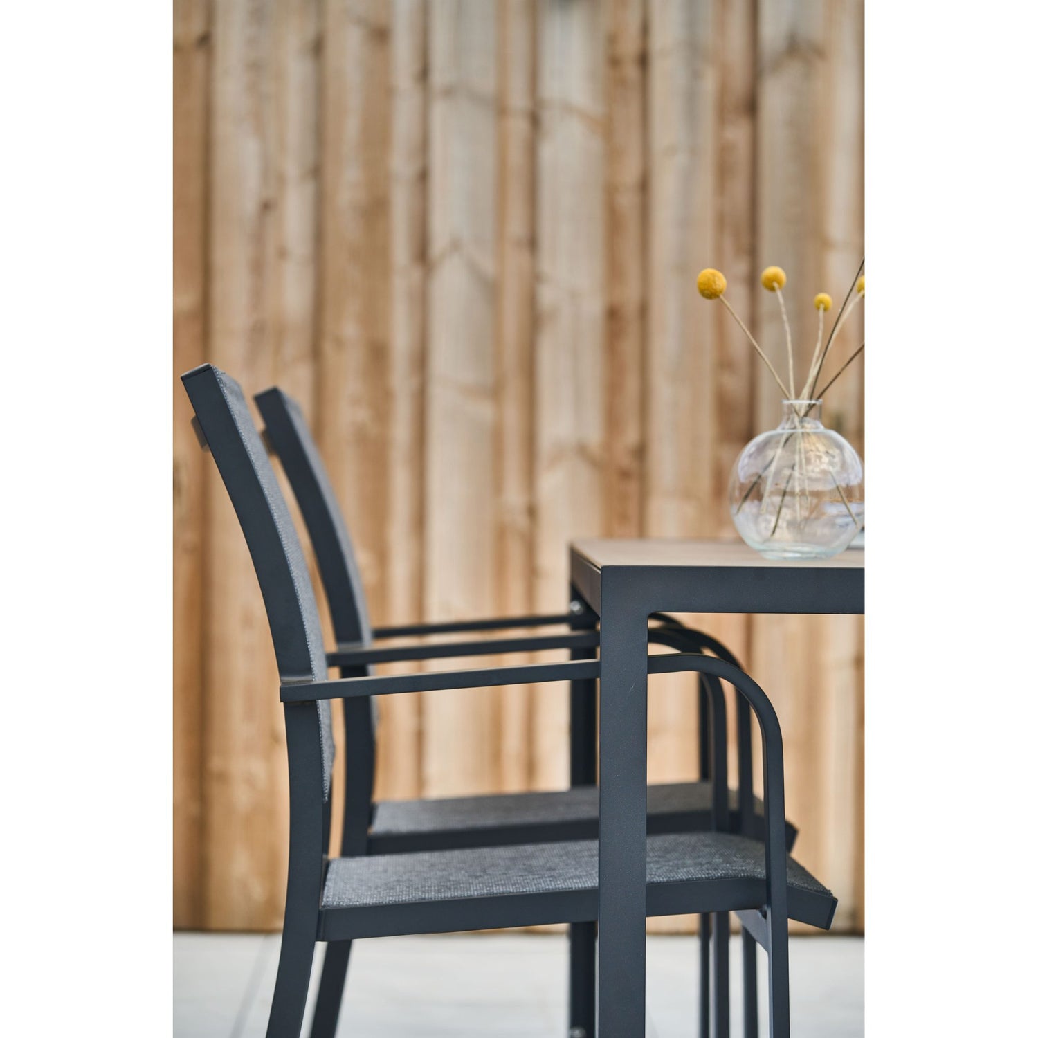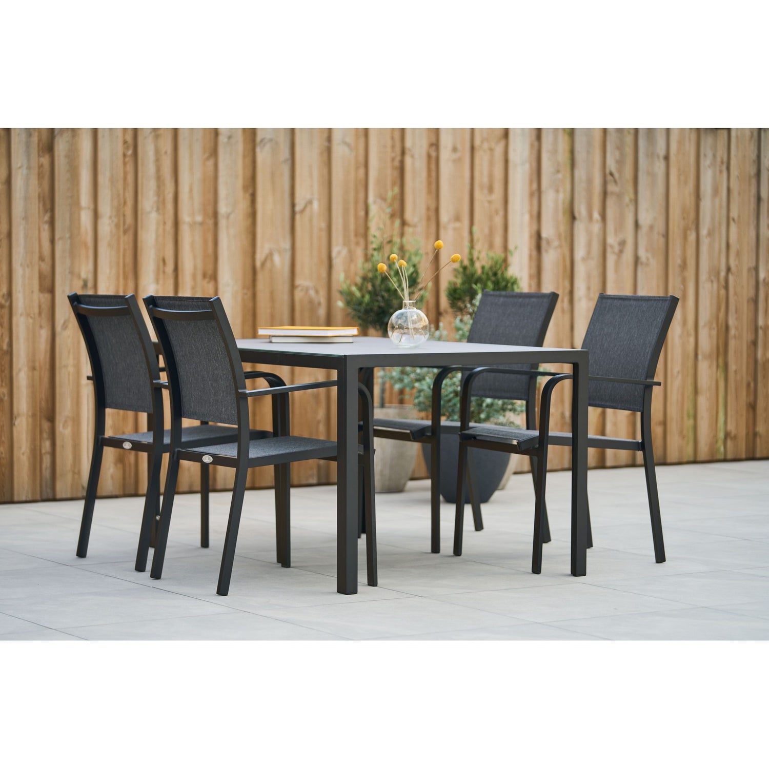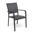 En stilren och lättskött möbel i svart aluminium och grå textilen. Stolen är stapelbar.