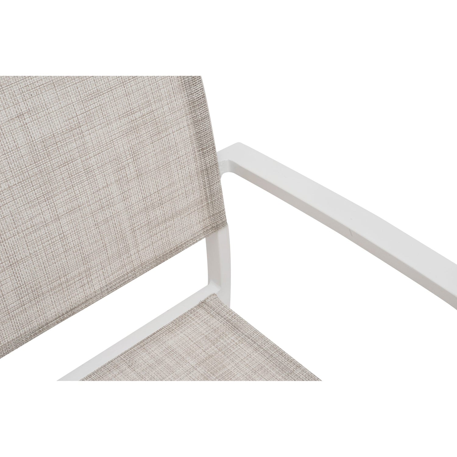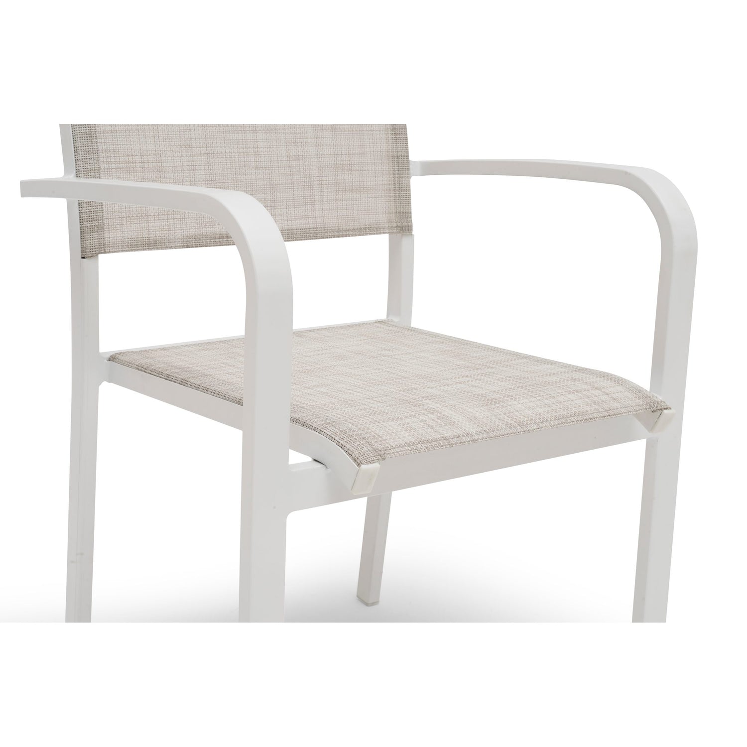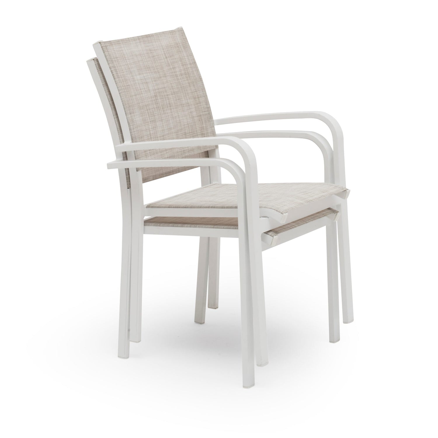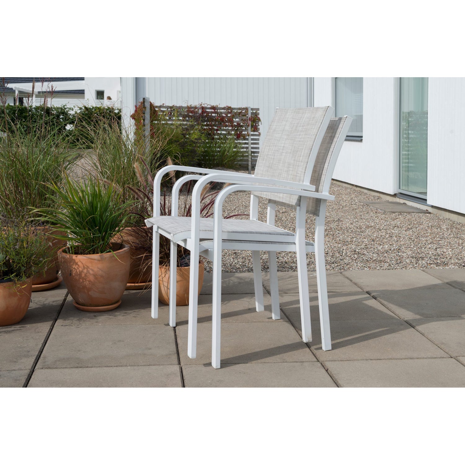 En stilren och lättskött möbel i vit aluminium och gråbeige textilen. Stolen är stapelbar.