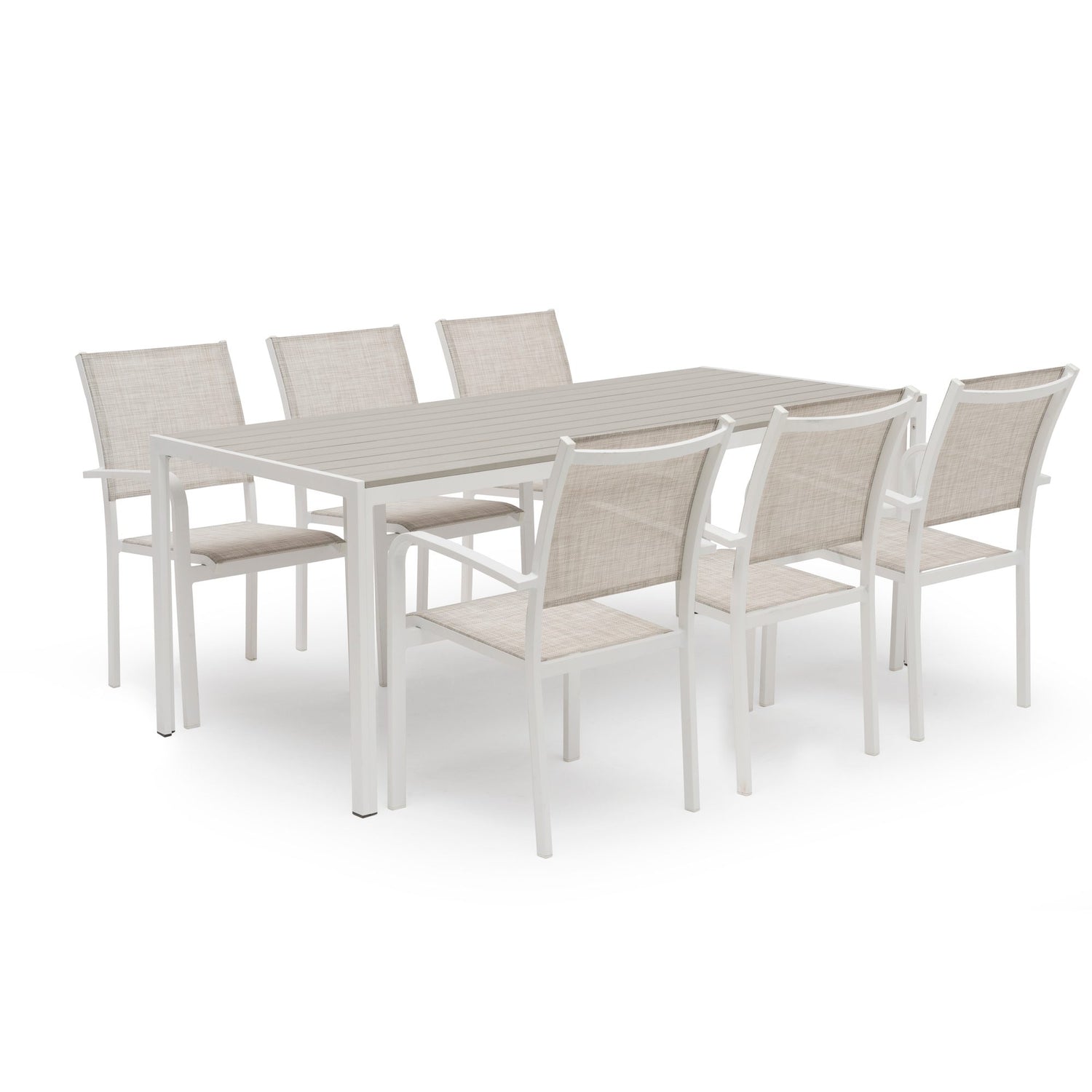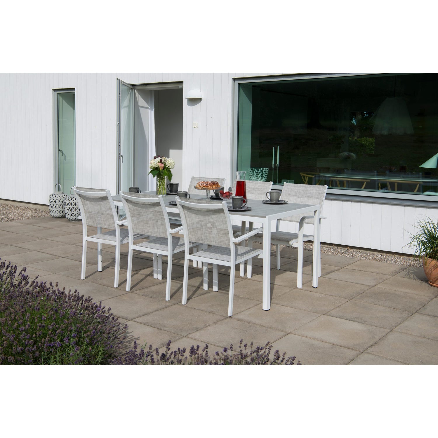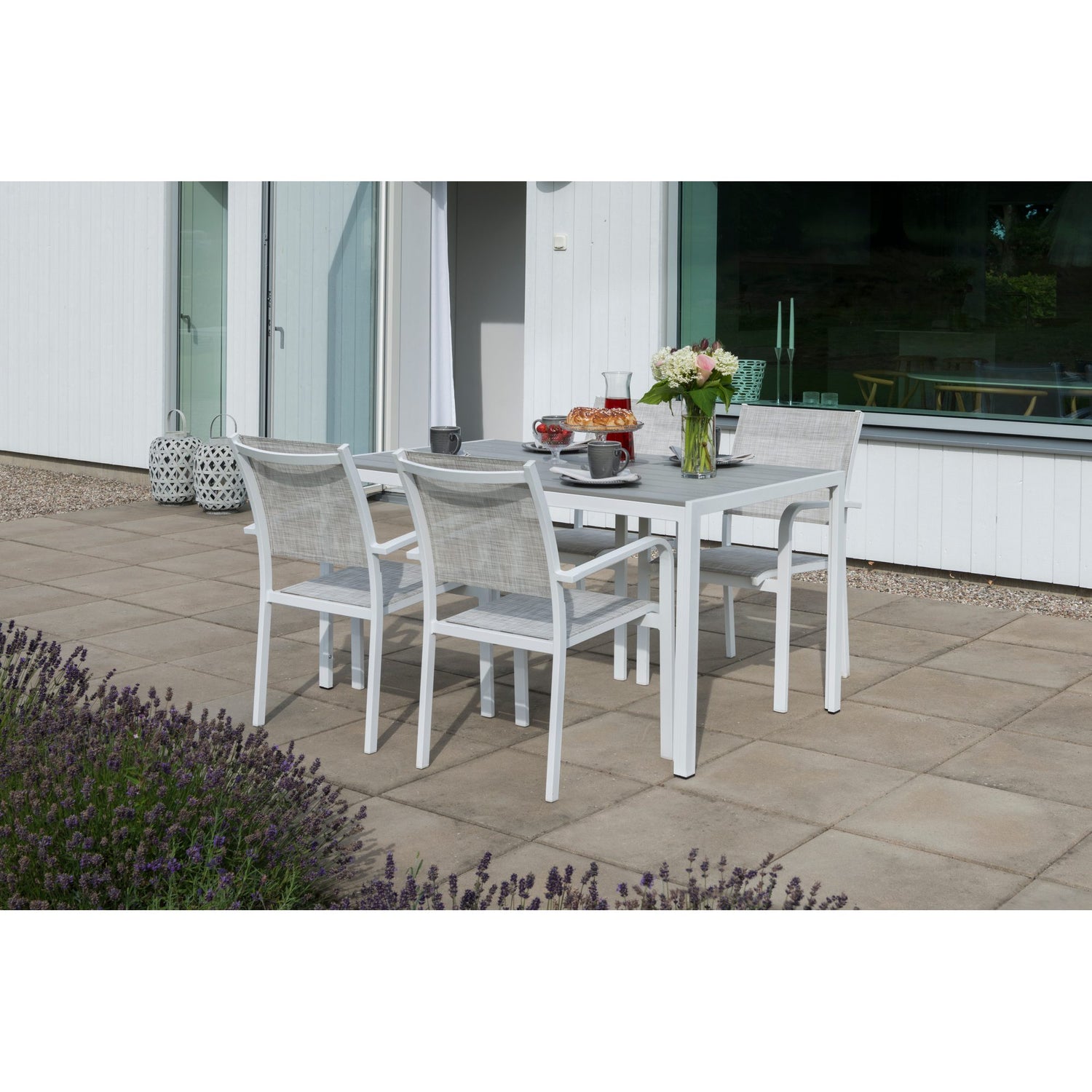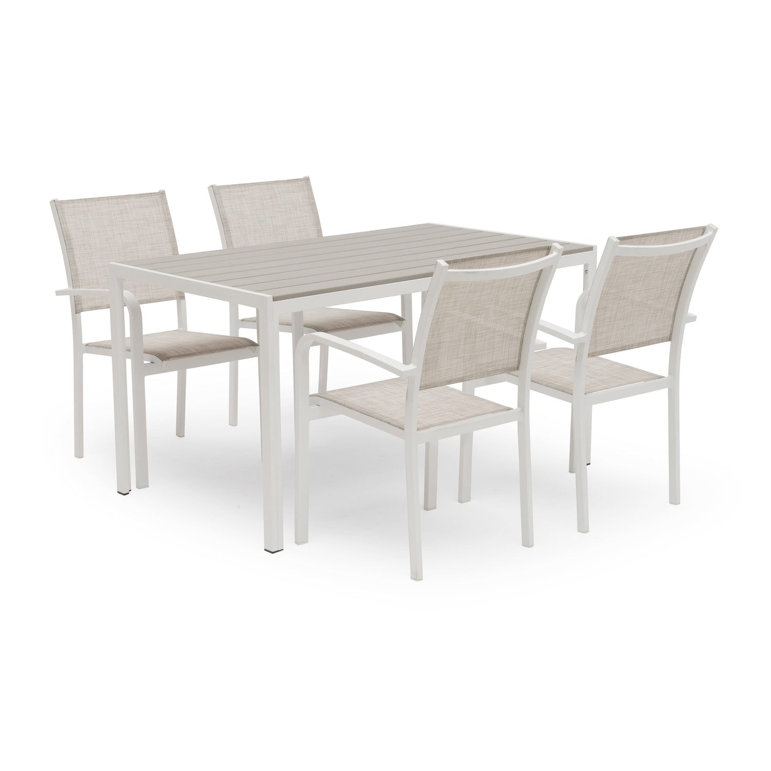 En stilren och lättskött möbel i vit aluminium och gråbeige textilen. Stolen är stapelbar.