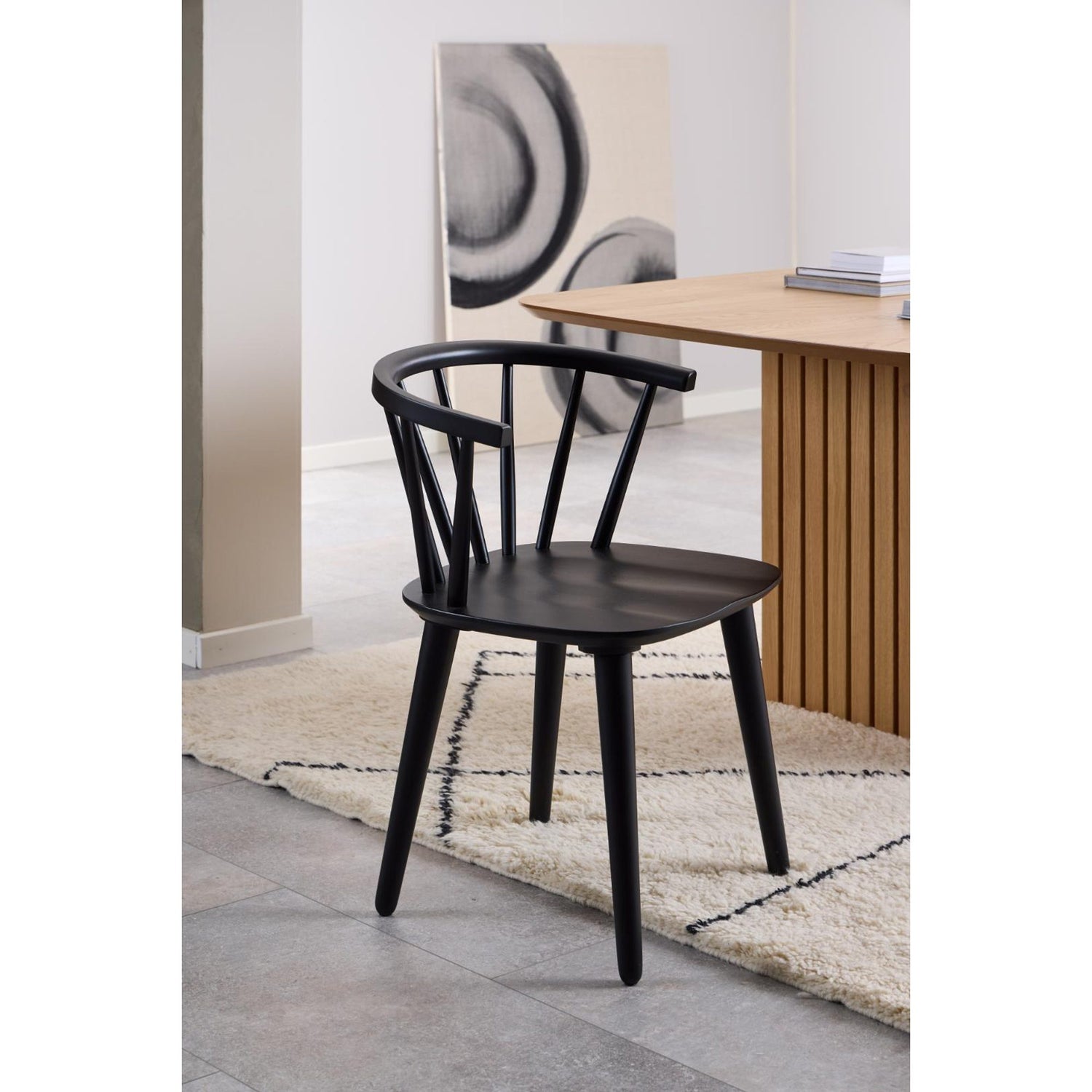 Denna matstol kännetecknas av en svartlackerad yta och en lätt form, vilket skapar en lugn atmosfär även i hektiska matsalar. Det böjda ryggstödet i ek omfamnar din kropp för ultimat komfort.