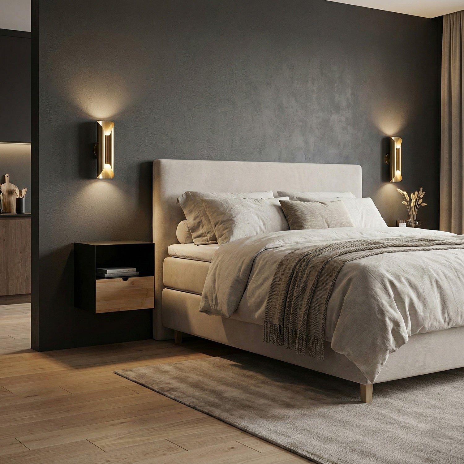 Detta sängbord från kombinerar bambu och metall i en minimalistisk väggenhet perfekt för sovrummet eller hallen.