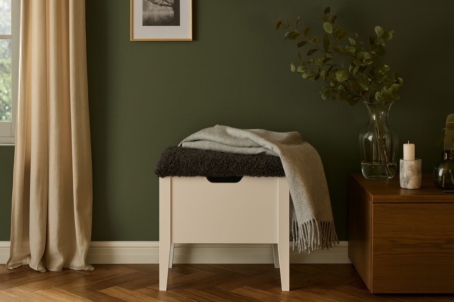 Men Klinte är mer än bara en vacker möbel. Den är också praktisk och flexibel. Välj mellan olika klädslar på toppen – grått ulltyg, grå fårskinnsimitation, äkta fårskinn eller det ljusgråa tyget Chelsea – för att skapa din perfekta kombination. På insidan av bänken finns ett fack med praktiska förvaring.