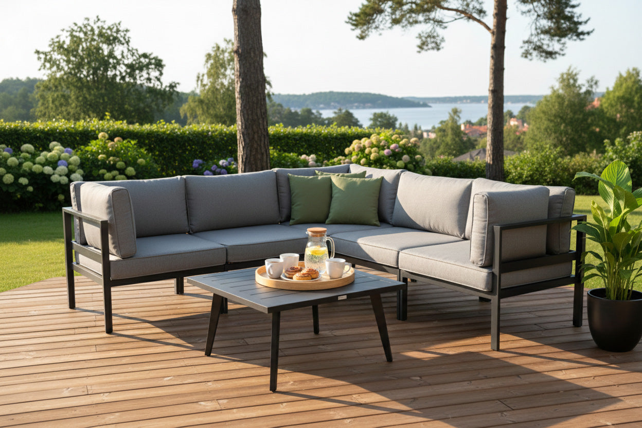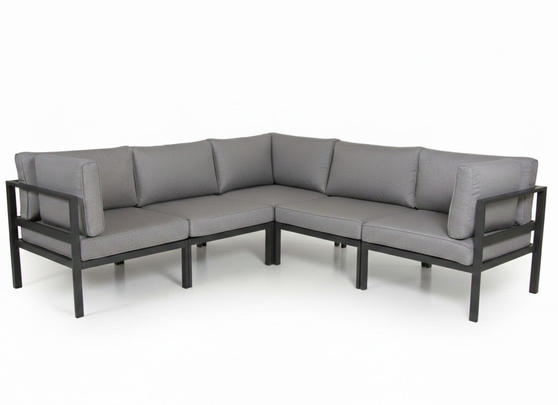 Leone är en stilren och modern modulsoffa i matt svartlackad aluminium och gråmelerade dynor i slitstark polyester. Den är helt underhållsfri men dynorna bör förvaras i en dynlåda. Med mittdelen kan du tillsammans med hörndelarna bygga ihop en soffa som passar just din altan eller balkong. Leone har en nätt design och passar därmed utmärkt på mindre utrymmen samtidigt som den har en underbar sittkomfort.