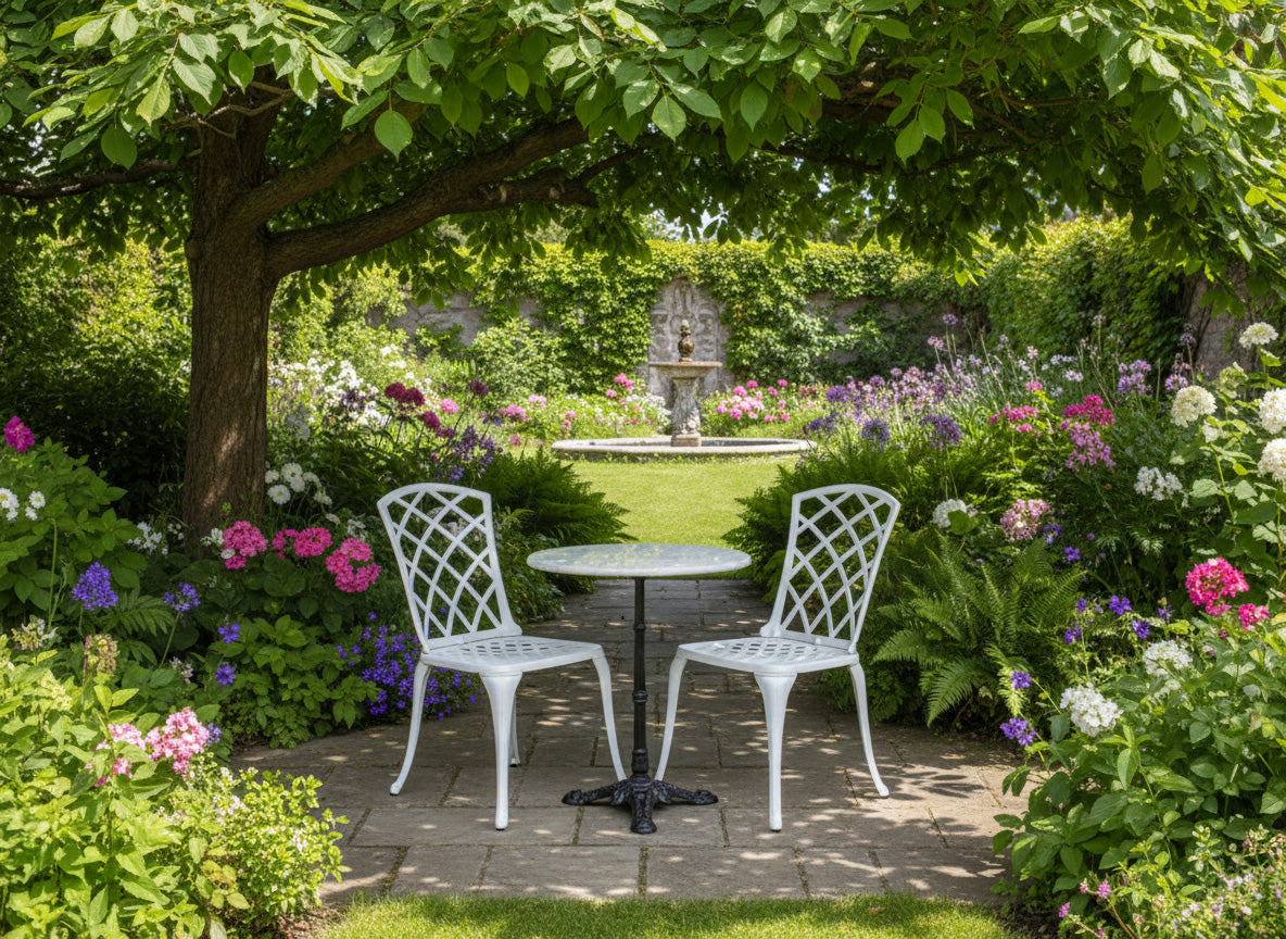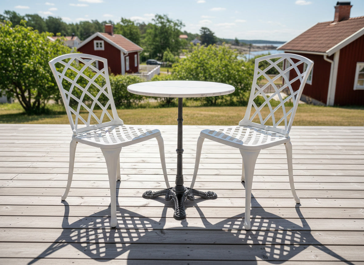Cafégrupp med Arras gjutna caféstolar i aluminium och Loire cafébord med ett underrede i gjutjärn och bordsskiva av marmor. En tidlös cafégrupp som passar lika bra på den lilla balkongen som ute på torpet. Marmorskivan är ett naturmaterial vilket innebär att ingen bordsskiva är den andra lik.