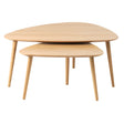 Marilyn Triangel är ett set med två satsbord i naturlig ekfaner. De mjukt avrundade, triangelrunda skivorna och de smäckra benen ger en varm, skandinavisk känsla. Använd borden tillsammans som ett större soffbord eller separera dem för extra avställningsytor. När du vill frigöra golvytan skjuter du in det mindre bordet under det större.