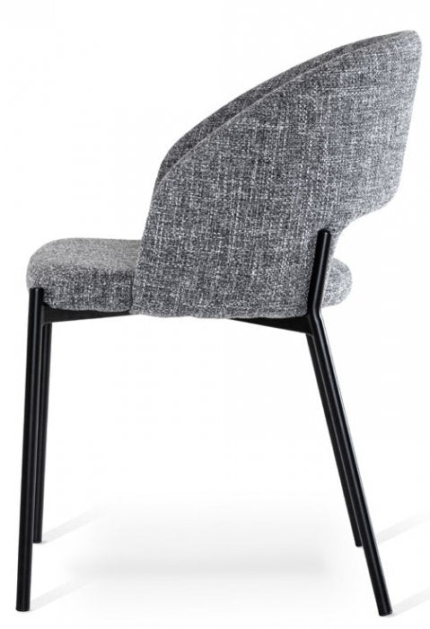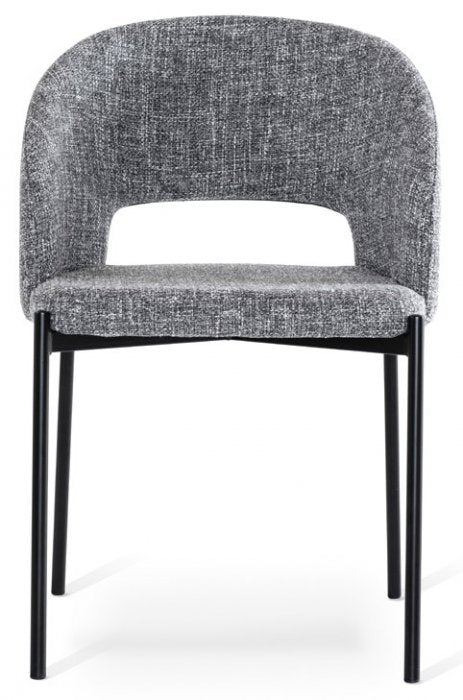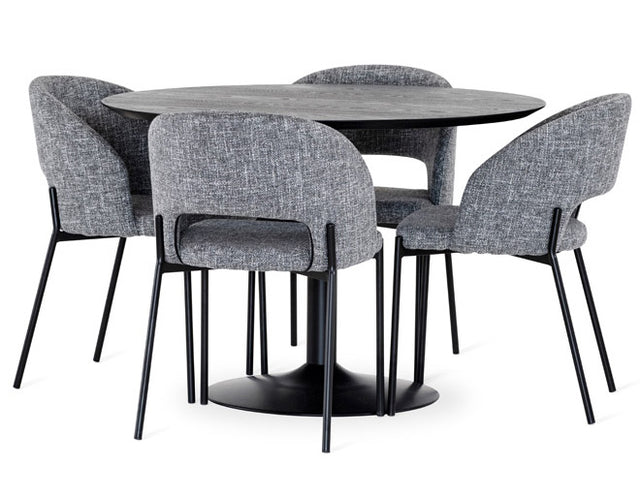 I detta set ingår 4st Gap stolar med gråmelerat tyg och Miles matbord med svart topp.