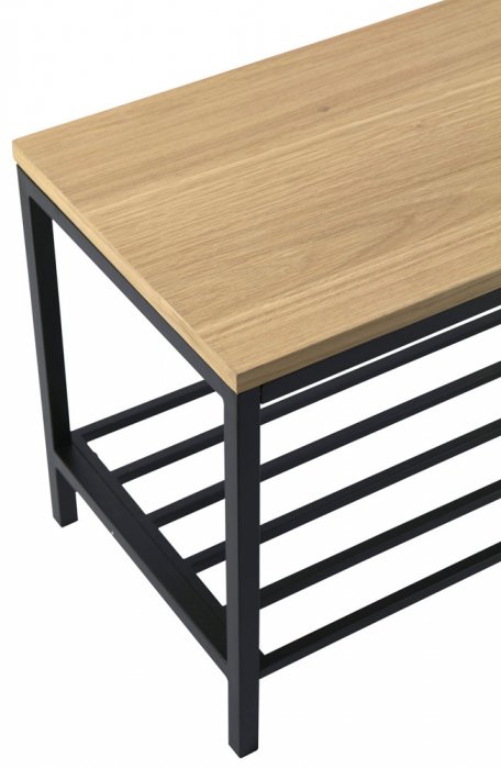 Mondo är en modern och nätt bänk från Nordic Furniture Group. Mondo har en toppskiva i ek med ett elegant och nätt underrede i svartlackad metall. Under toppskivan finns ett praktiskt skoställ. Mondo är ett underbart alternativ för dig som gillar ek mot svart metall och vill ha en praktisk och elegant hallmöbel.