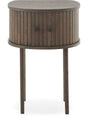 Nilo sängbord från Nestic är en nätt och stilren nattduksbordslösning i brunlackad ek med fanér som framhäver den levande ådringen. Den ovala toppskivan, de rundade gavlarna och den ribbade fronten ger ett elegant uttryck som harmonierar med övriga möbler i serien. De smäckra runda benen gör sängbordet lättplacerat även i mindre sovrum.
