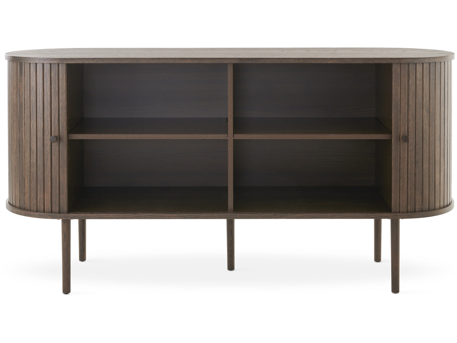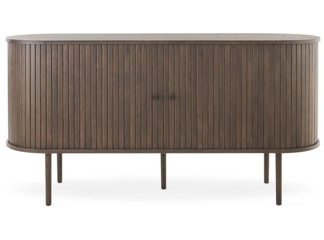 Nilo sideboard från Nestic förenar varm träkänsla med tydlig form. Skåpet är tillverkat i brunlackad ek med fanér som framhäver ådringen. De rundade gavlarna, den ovala överdelen och den ribbade fronten ger ett elegant uttryck, medan de smäckra runda benen gör möbeln lätt och enkel att placera i både hall, vardagsrum och matplats.