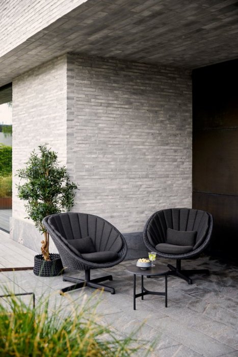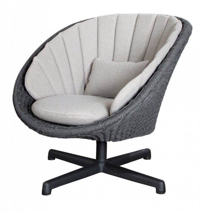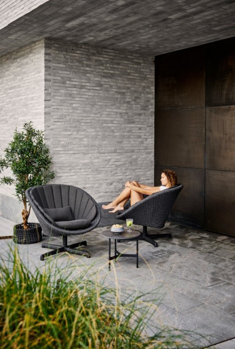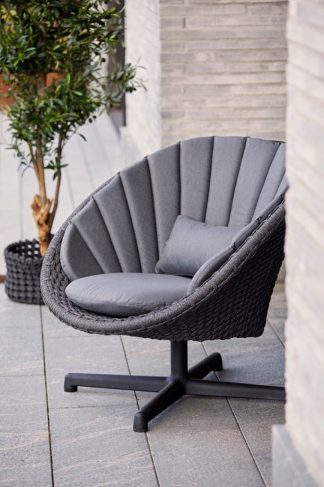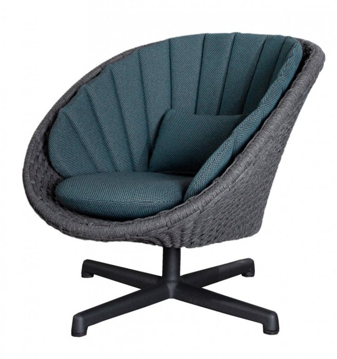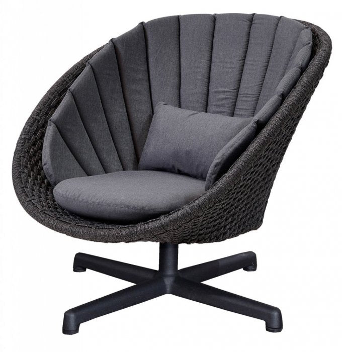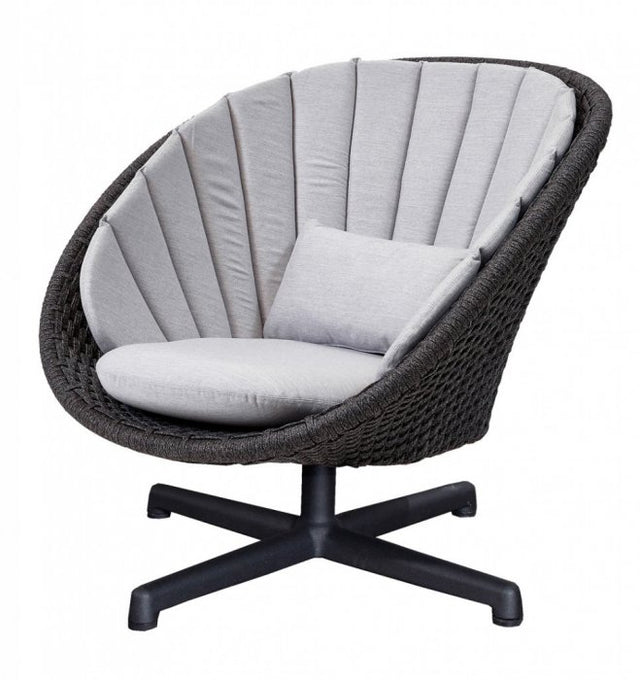 Peacock är en modern och cool loungefåtölj från danska Cane-Line. Stommen är tillverkad i slistark och härdat konstrotting med en stomme i aluminium. Peacock är godkänd för offentlig miljö. Likt namnet är designen inspirerad av påfågeln framförallt tillsammans med den snygga dynan som går att köpa till. Dynan är tillverkad i Sunbrella tyg som helt vattentät. Nu med härlig snurrfunktion.