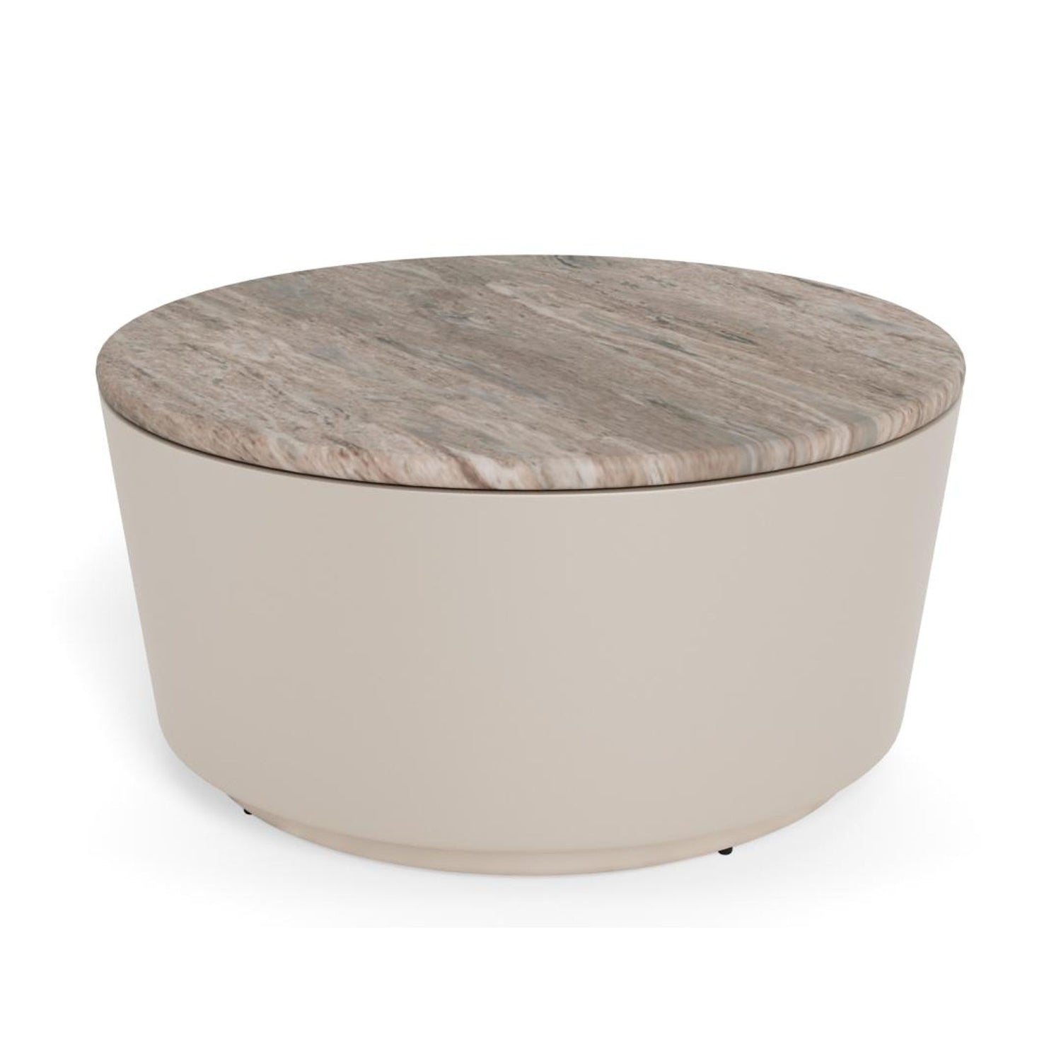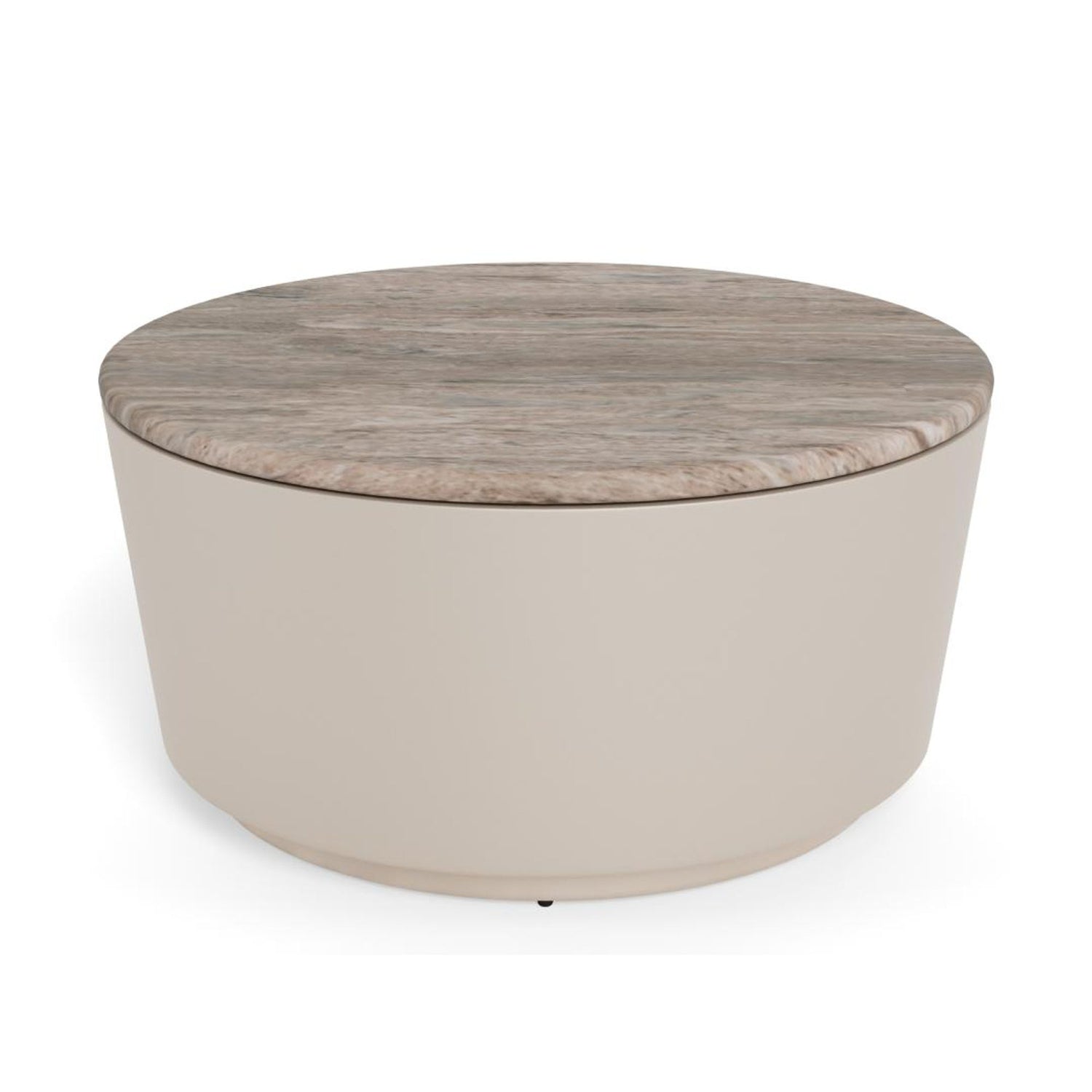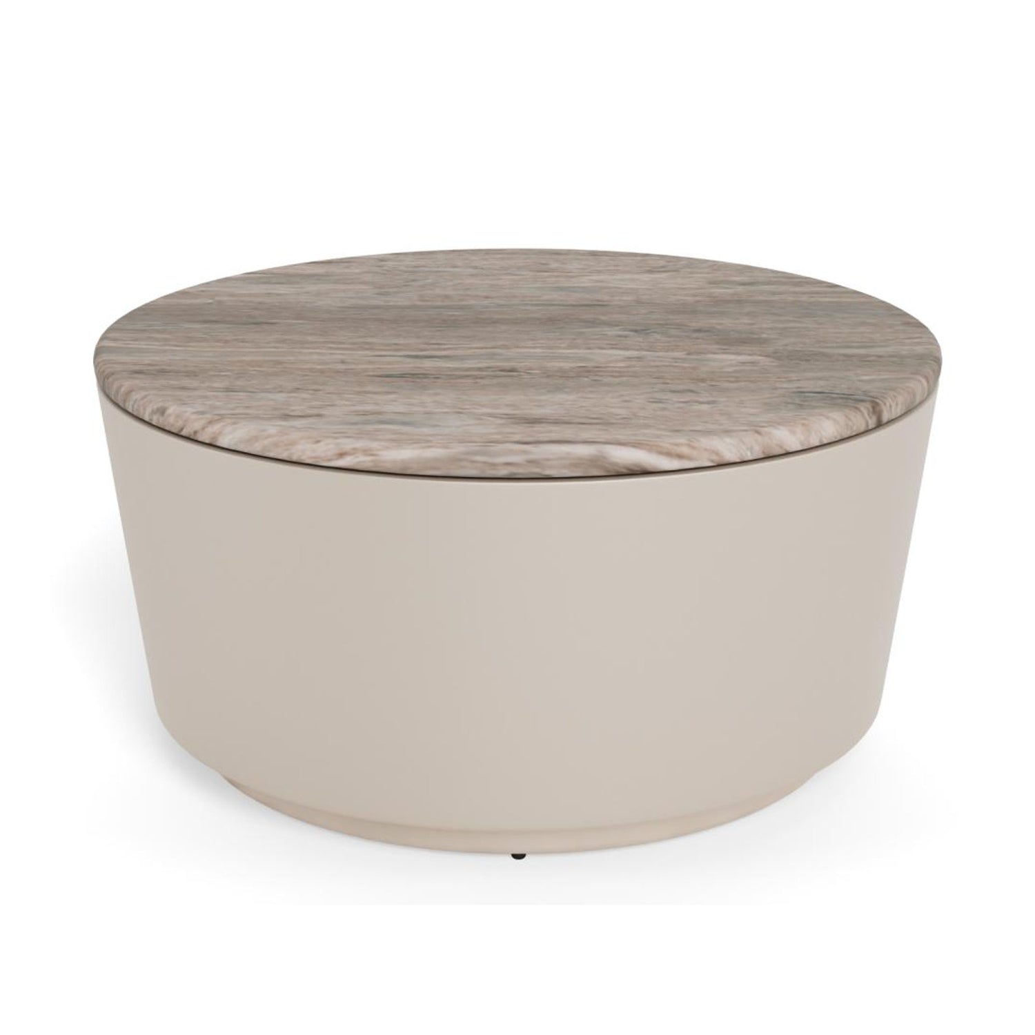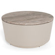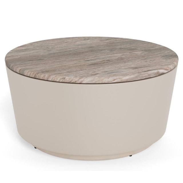 Ett runt soffbord som förenar djärva material och mjuka former. Den polerade grå marmorskivan ger en naturlig färgdjup, medan den grå grova pulverlackade basen tillför en subtil metallisk glans. Tillsammans skapar de en raffinerad fokuspunkt med en skulptural närvaro i rummet.