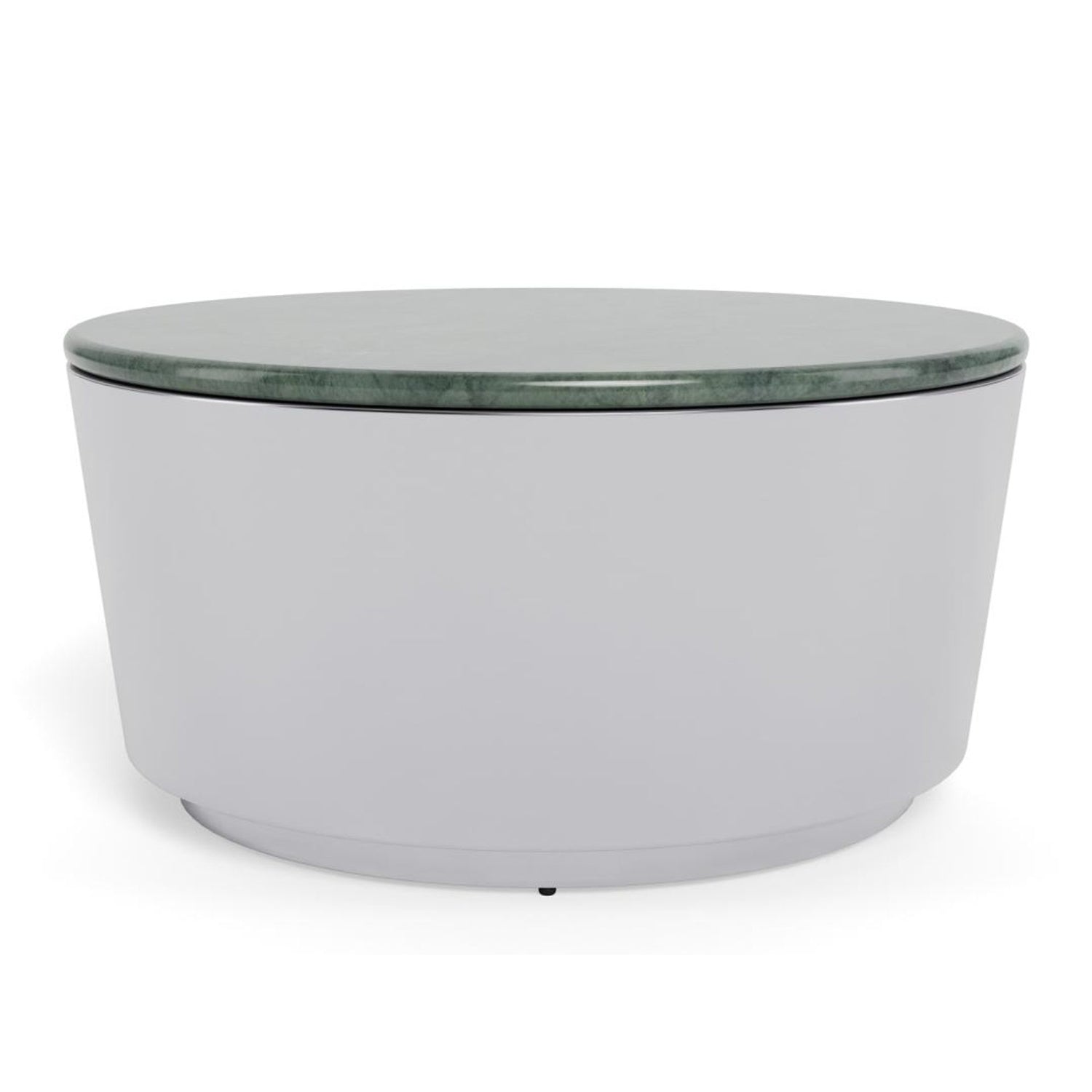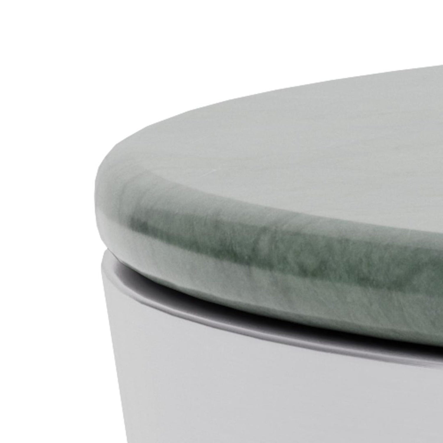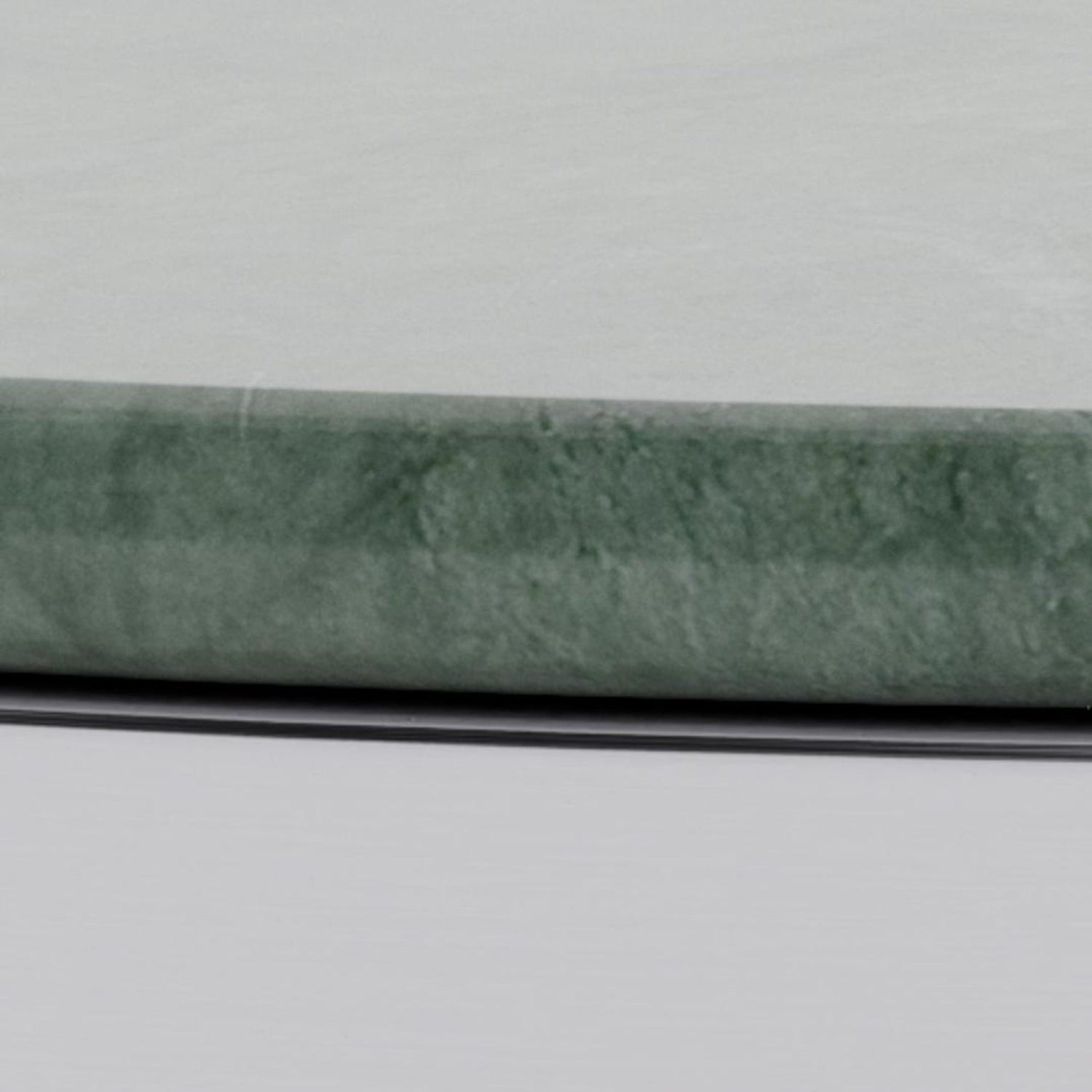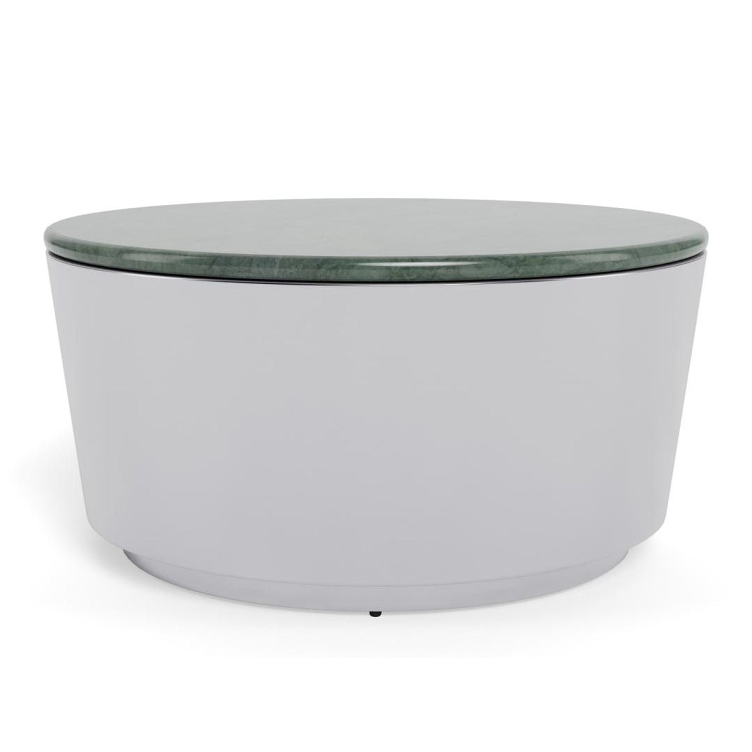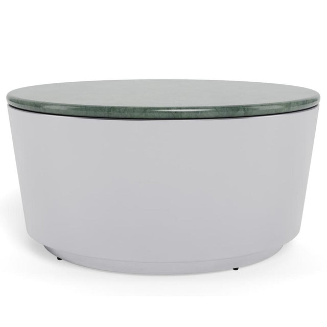 Ett runt soffbord som förenar djärva material och mjuka former. Den polerade gröna marmorskivan ger en naturlig färgdjup, medan basen av borstat nickel ger en subtil metallisk glans. Tillsammans skapar de en förfinad fokuspunkt med en skulptural närvaro i rummet.