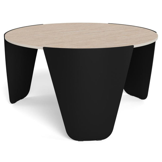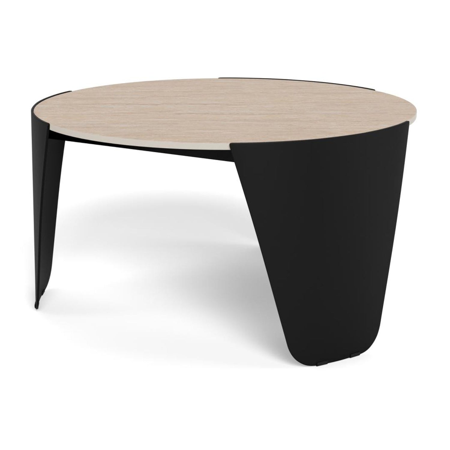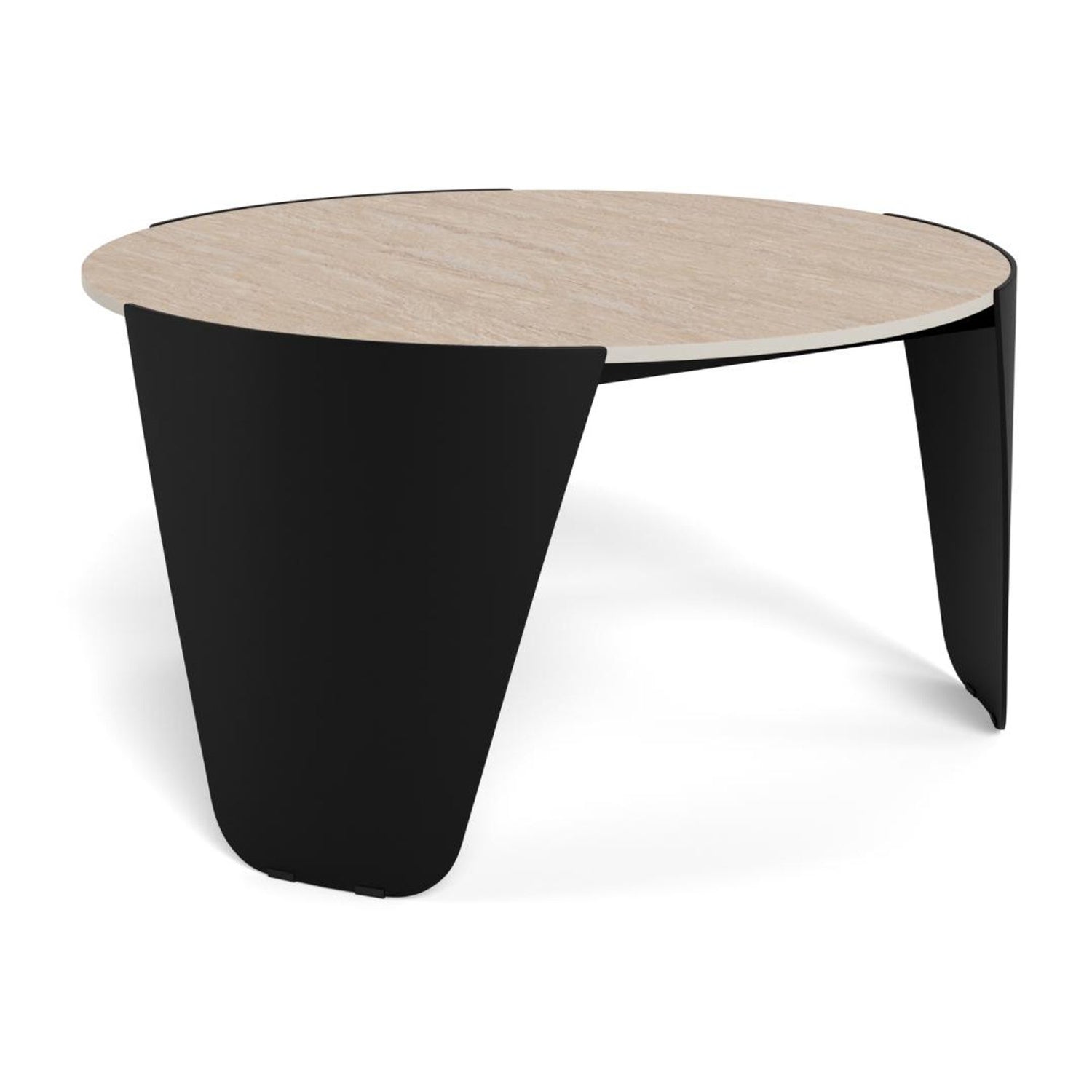 Omfamna den nya looken av detta moderna soffbord. Det kombinerar moderna och praktiska material i en elegant men ändå diskret design. De platta benen, gjorda av svart stål, kompletterar den runda toppen prydd med ett subtilt beige motiv. Detta är ett bord som kommer att fräscha upp vilket modernt vardagsrum som helst.