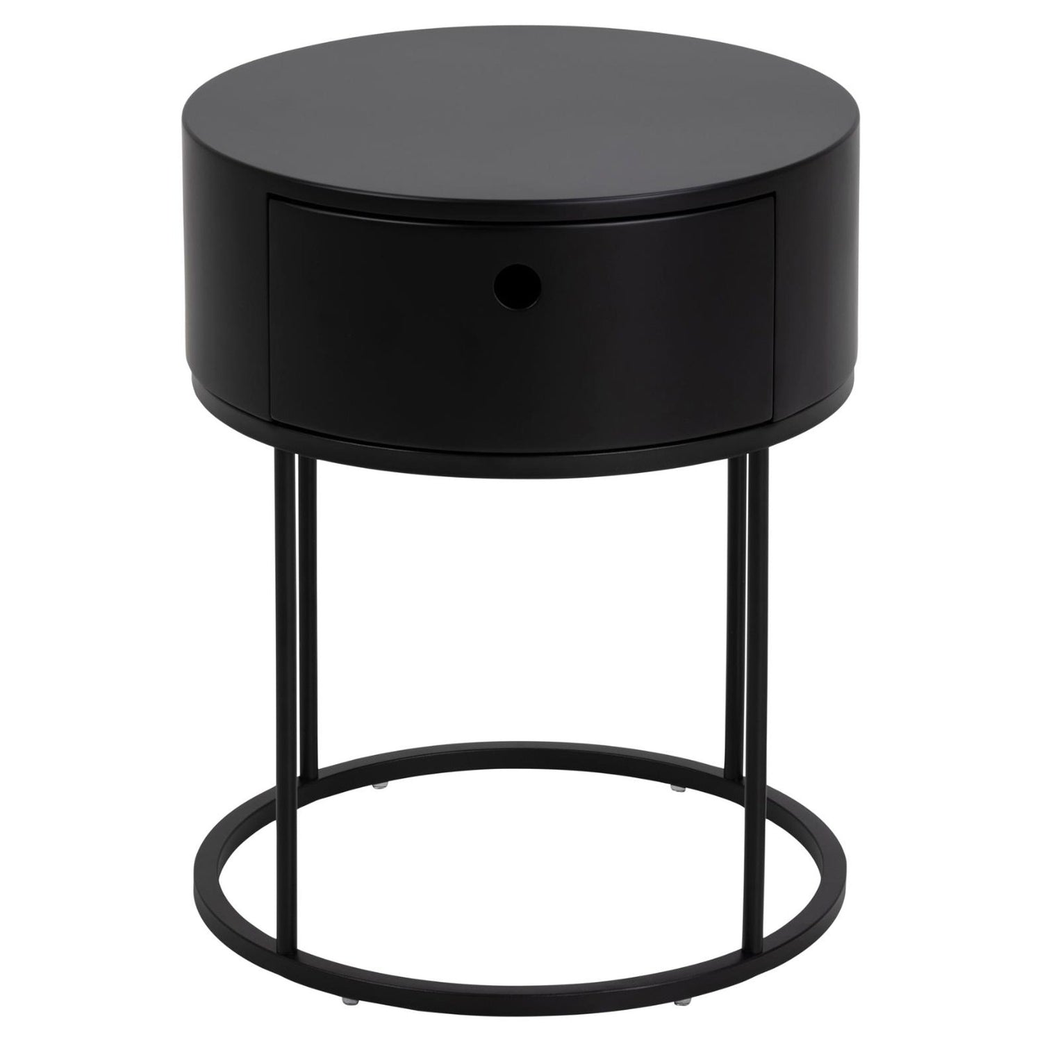 Ett diskret sängbord som erbjuder både stil och förvaring med sin minimalistiska och runda design.
