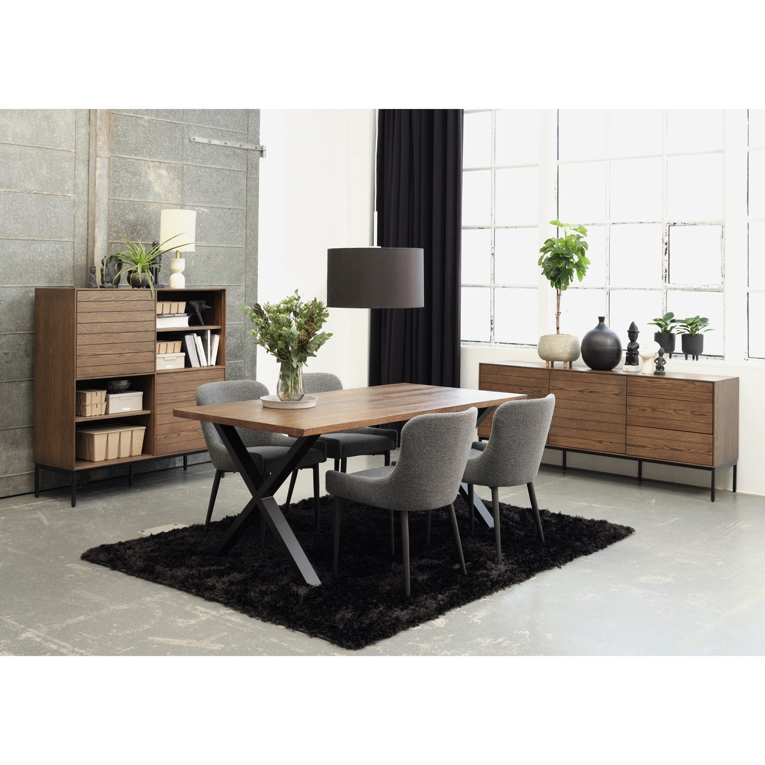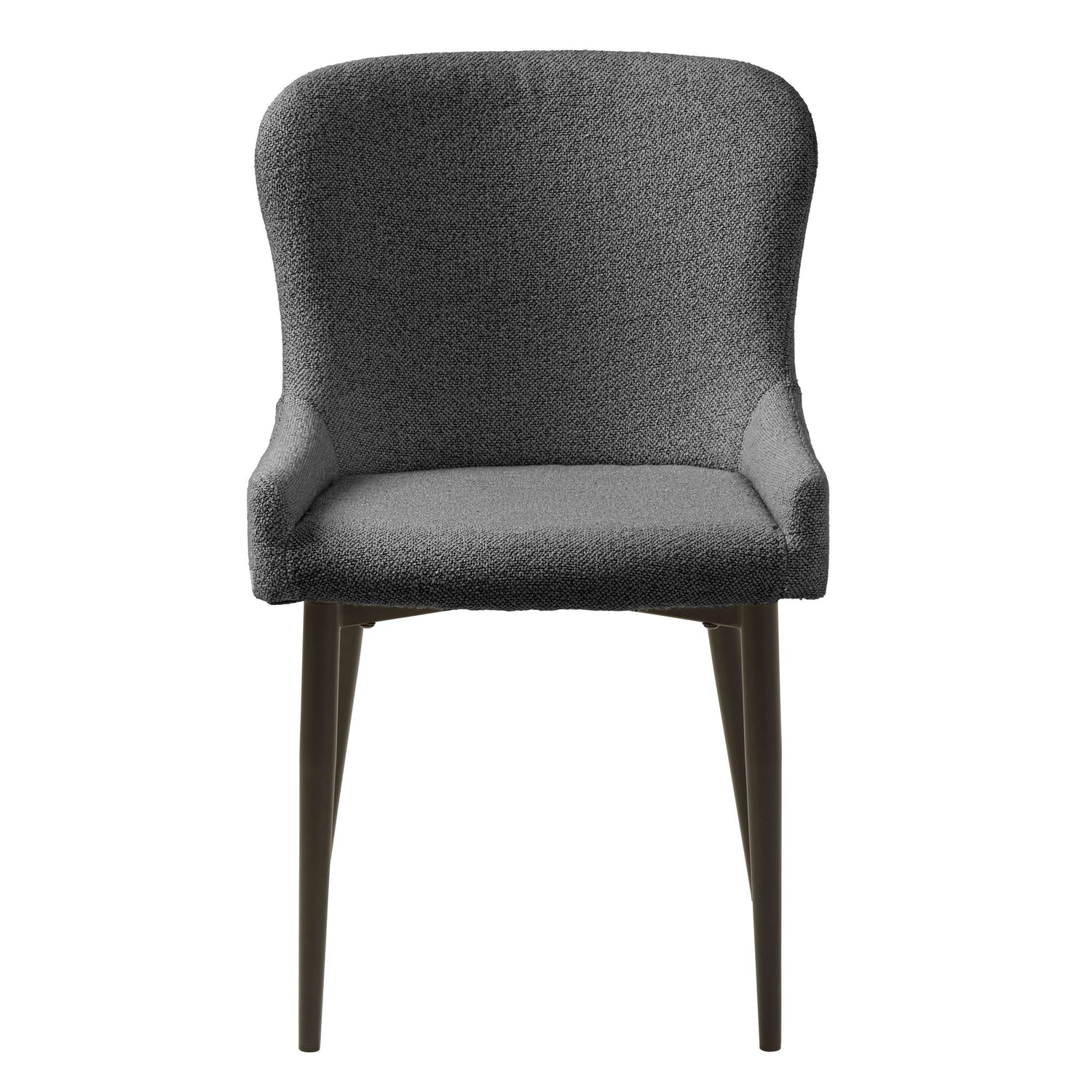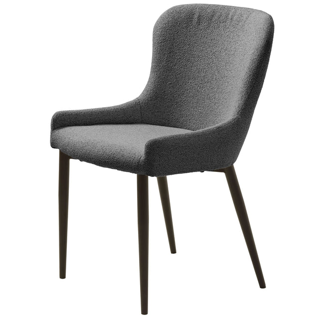 Punto är en modern matstol med mjukt klädd sits och omslutande rygg som ger skönt stöd genom hela middagen. Den slanka siluetten och de avsmalnande benen i mörk metall håller uttrycket lätt och stabilt, medan den grå texturen är enkel att matcha med både trä och metall, lika rätt i köket som i matsalen.