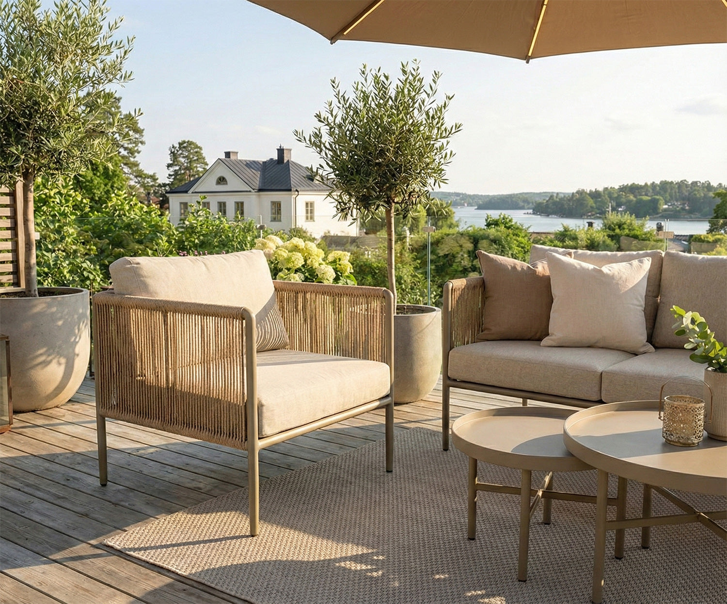 Stommen är tillverkad i khakifärgad aluminium som ger en stabil men lätt konstruktion anpassad för utomhusbruk. Materialet är tåligt mot väderpåverkan och kräver minimalt med underhåll. Armstöden är klädda i naturfärgat rep som tillför en mjuk och varm känsla och skapar en fin kontrast mot aluminiumramen.