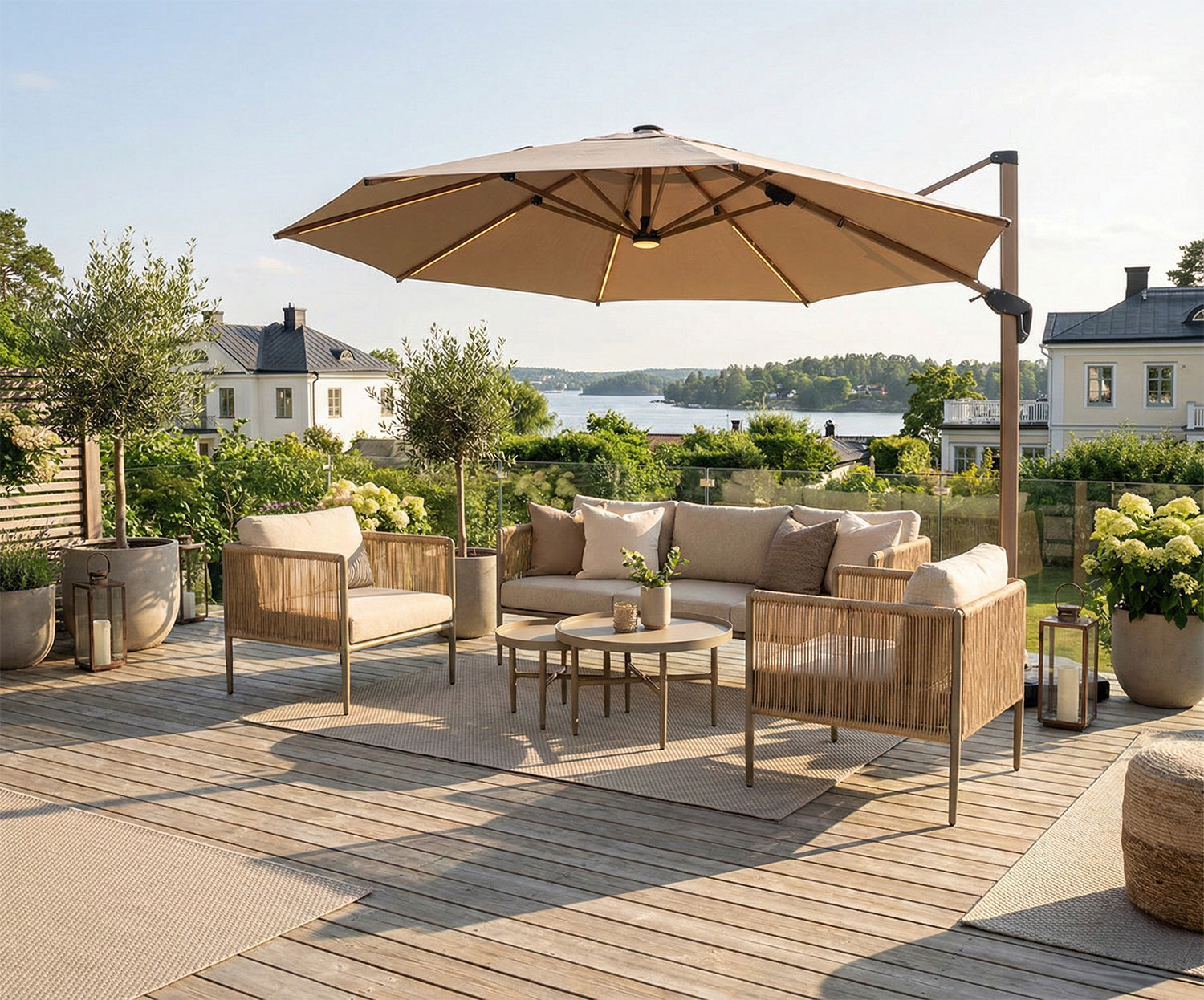 De generösa dynorna är klädda i beige olefintyg med liner som är både slitstarkt och vattenavvisande. Dynornas tjocklek ger hög sittkomfort och gör soffgruppen bekväm även under längre stunder av avkoppling och umgänge.