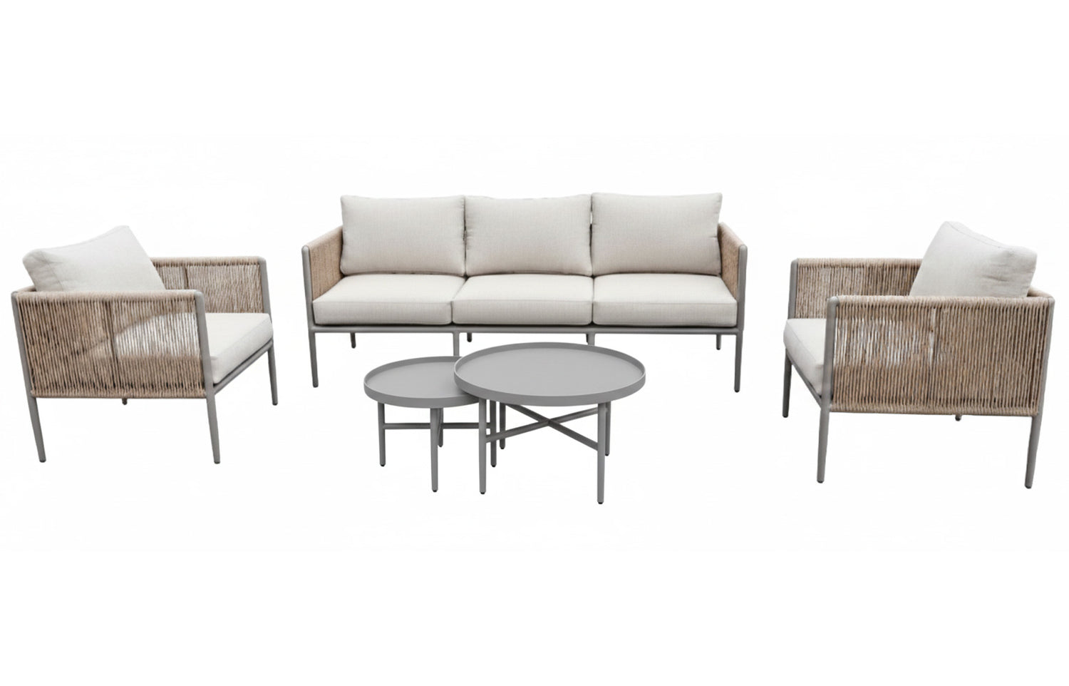 Ravenna soffgrupp består av en rymlig tresitssoffa och två loungefåtöljer som tillsammans erbjuder gott om plats för familj och gäster. De två medföljande satsborden i aluminium ger praktisk avlastningsyta för servering, böcker eller dekorationer. Bordens runda former förstärker den mjuka och avslappnade känslan i möbelgruppen.