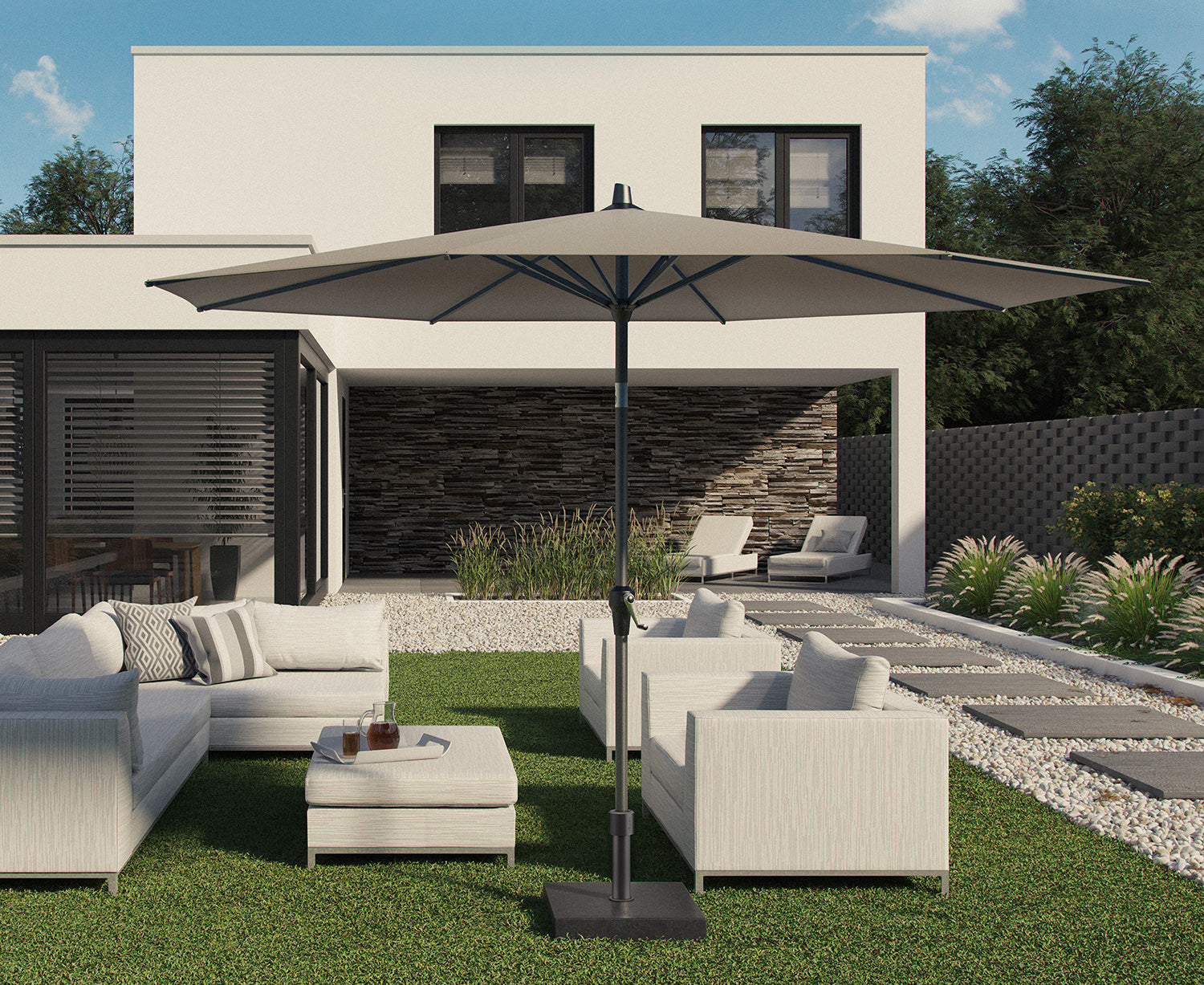 Riva är ett parasoll som kombinerar användarvänlighet, hållbar konstruktion och modern formgivning – ett perfekt val för en bekväm och stilfull utemiljö.