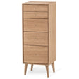 Scandi byrå i fanerad oljad ek. Scandi byråer är en uppskattad serie i skandinavisk design. Massiva svarvade utställda träben. De fem självstängande lådorna är snyggt inramade av byråns yttersidor, toppskiva och bottenplatta. Stålknoppen är diskret och nätt. I serien finns även två andra byråer. Byrån finns även i vitoljad ekfanér och heter då Nordik. Båda serierna tillverkas i Europa.