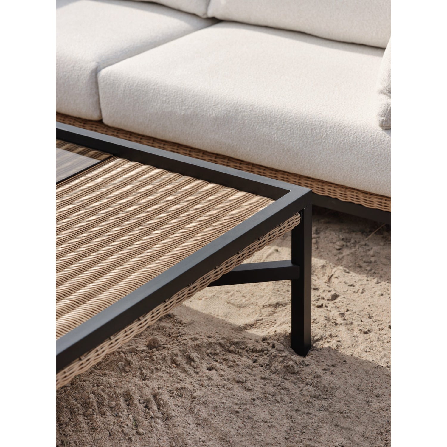 Ett soffbord i rotting och en härdad glasskiva. Det som skiljer Shell åt är dess unika blandning av designinfluenser. De rena linjerna och de neutrala färgerna för den lugna enkelheten i skandinavisk design, medan värmen och känslan från konstrotting fångar den avslappnade, soliga känslan från Medelhavet. Denna blandning gör Shell till det perfekta valet för en utomhusoas som är både trendig och tidlös. Den öppna ryggen visar ramen, ytterligare en designdetalj. Ram i svart aluminium och dynor i vitt olefintyg.