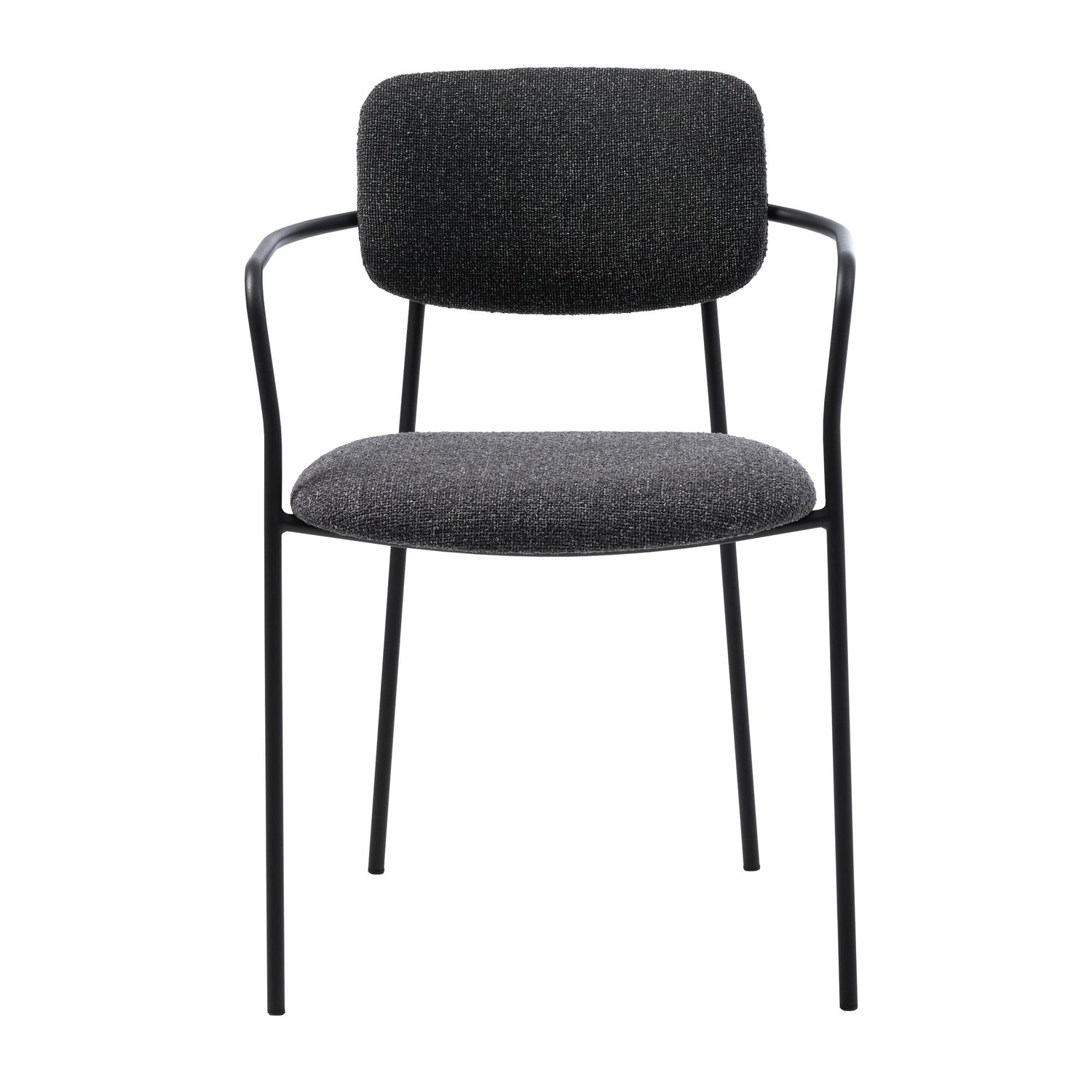 Stella är en luftig och modern stol med klädd sits och rygg i tålig mörkgrå textil. Den smala, puderlackerade metallramen med integrerade armstöd ger ett elegant och bekvämt stöd utan att ta mycket plats runt bordet. En lättmatchad stol som passar lika bra i köket som i matsalen eller hemmakontoret. Finns även i offwhite.