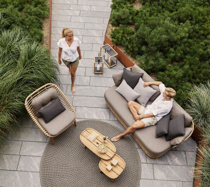 String är en inbjudande soffa som designats av den danska designerduon Foersom & Hiort-Lorenzen MDD. Soffan har en stomme i teak som ger soffan en härligt varm glöd. Själva soffan är tillverkad av det väderbeständiga och robusta materialet Cane-line Weave® på en stadig aluminiumram. Soffan har en rottingliknande färg som ger ett naturligt och lugnt uttryck och som passar i de flesta uterum. String tar inte mycket plats och passar därför perfekt till små uterum.