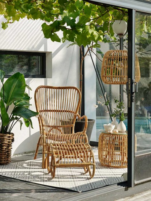Vallda är en serie med stolar, bord, hänggunga och lampskärm i naturrotting med fina detaljer. Naturrotting är flätad rotting där skalet har behållits vilket ger en mer naturlig färg och naturliga oregelbundenheter. Möbler i rotting bör placeras under tak.