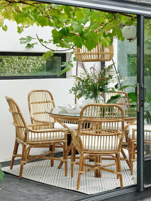 Vallda är en serie med stolar, bord, hänggunga och lampskärm i naturrotting med fina detaljer. Naturrotting är flätad rotting där skalet har behållits vilket ger en mer naturlig färg och naturliga oregelbundenheter. Möbler i rotting bör placeras under tak.