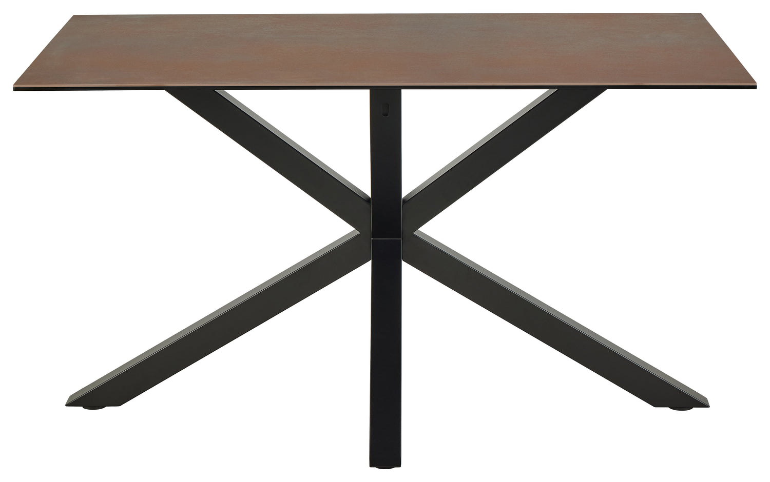 Verdun matbord kombinerar modern design med praktisk funktion och rymlig komfort. Den värme- och reptåliga keramiska bordsskivan har ett levande flammigt rostbrunt utseende som skapar en varm och inbjudande känsla.