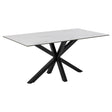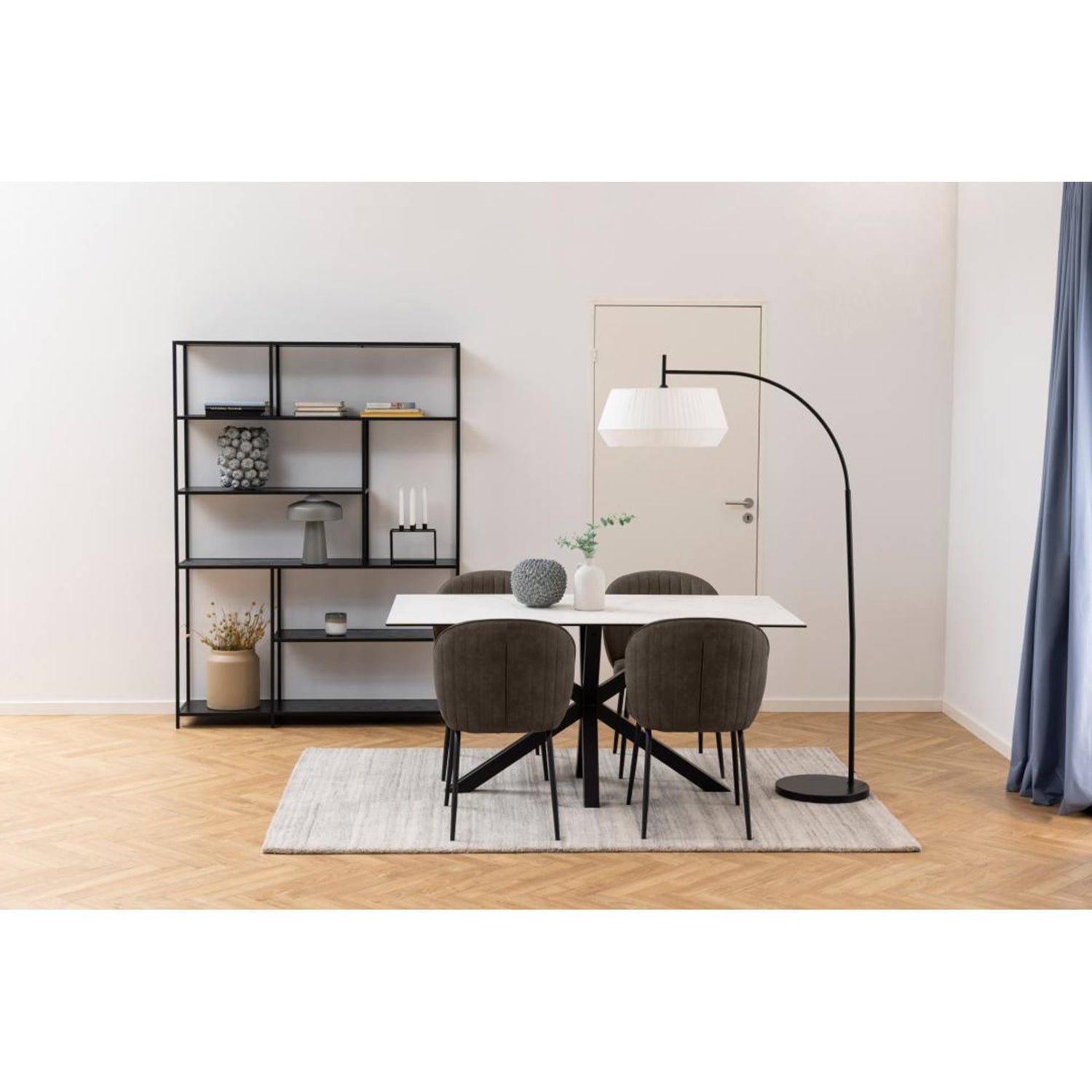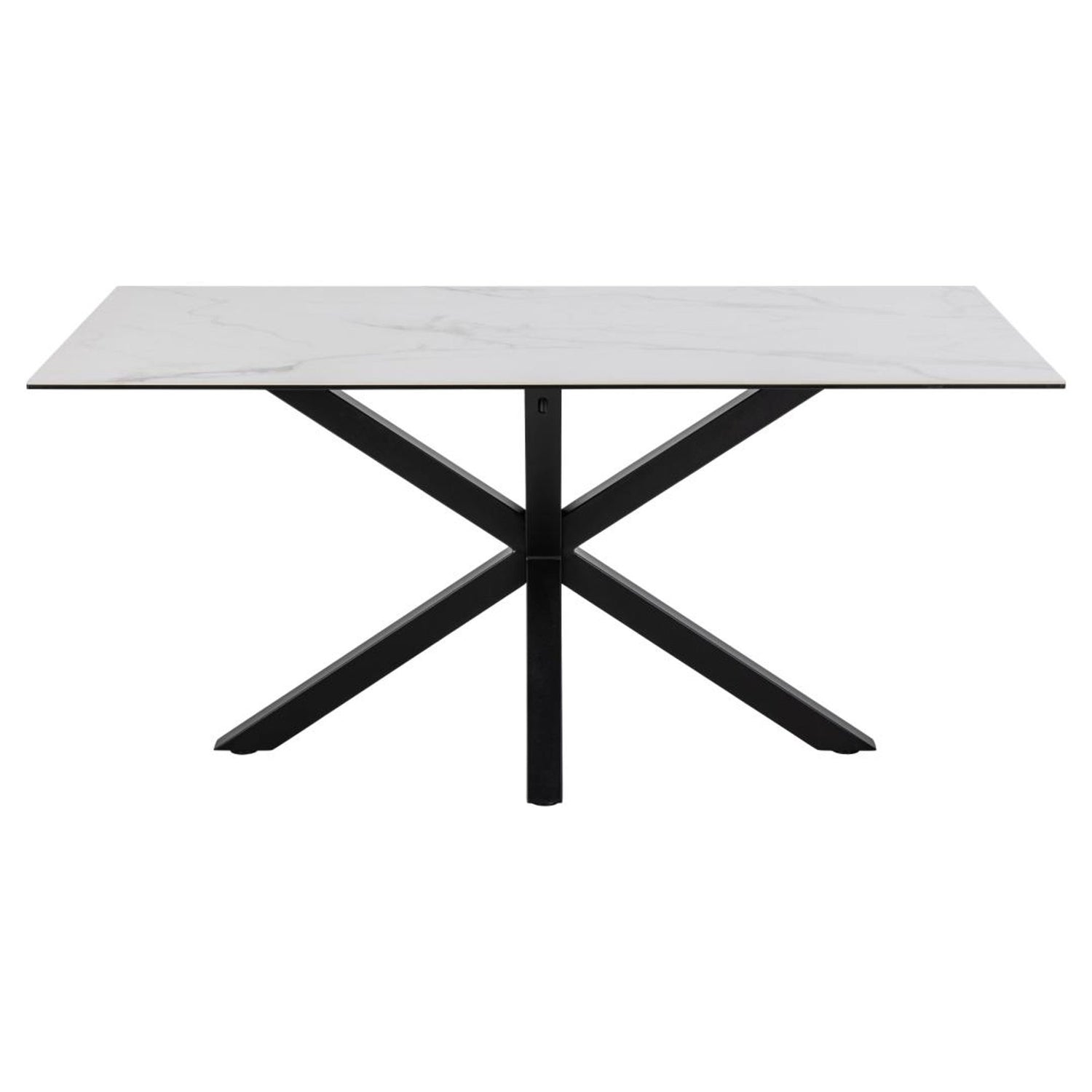 Verdun matbord kombinerar modern elegans med praktisk funktion och blir en stilren mittpunkt i matsalen. Den värme- och reptåliga keramiska bordsskivan har ett ljust vitt marmormönster som ger ett fräscht och exklusivt uttryck.
